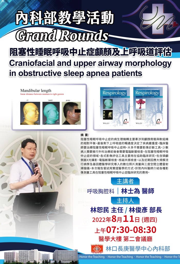 本週的Grand round,邀請到胸腔科林士為醫師主講"阻塞性睡眠呼吸中止症顱顏及上呼吸道評估,開拓了我們對於此領域的眼界。