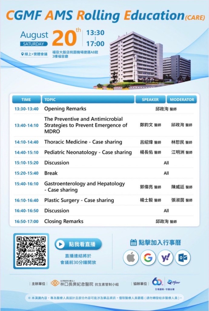 本週六8月20日下午13:30-17:00,本院抗生素管制小組於A8福容三樓福容廳舉辦CARE抗生素教育與案例討論會,有實體也有線上,歡迎大家參加。