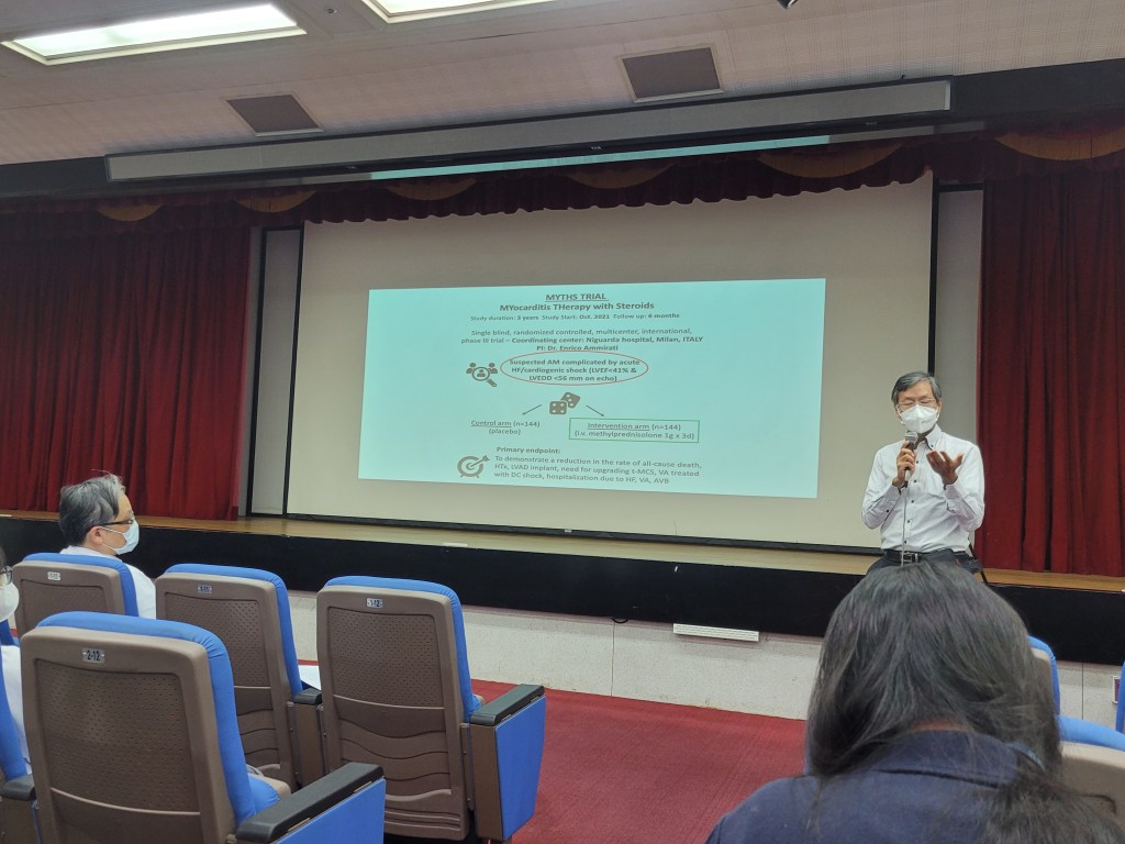 我這次討論的案例是一名猛爆性心肌炎的病患,病程進展快速且兇猛,短短一個小時內就從走著進急診室,變成休克血壓剩下70,需要緊急接上葉克膜支持。過去治療猛爆性心肌炎,除了少數幾種心肌炎種類有特殊療法之外,大部分都是靠支持性療法,撐到病患心臟功能自行恢復,或是等到可以裝上昂貴的心室輔助裝置,甚至心臟移植。但當時病患命懸一線的狀況,加上病患本身年紀偏大,可能不適合裝置心室輔助裝置或是後續接受心臟移植,在沒有退路的情況下,我們嘗試經驗性的為病患用上脈衝劑量類固醇及高劑量IVIG,病患的臨床狀況之後便快速的進步,目前出院在門診追蹤整體的情況維持的相當不錯,足以跟正常人一樣生活活動,是一個完美的結局。