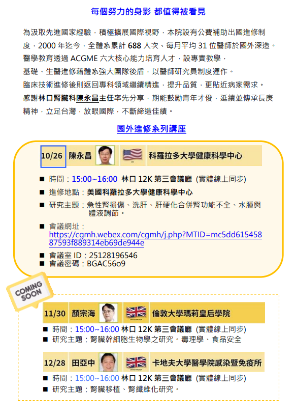 | 10/26(三) 15:00-16:00 12K 第三會議廳 | 推薦活動 腎臟科 國外進修系列講座 陳永昌主任 | https://cgmh.webex.com/cgmh/j.php?MTID=mc5dd615458 87593f889314eb69de944e |