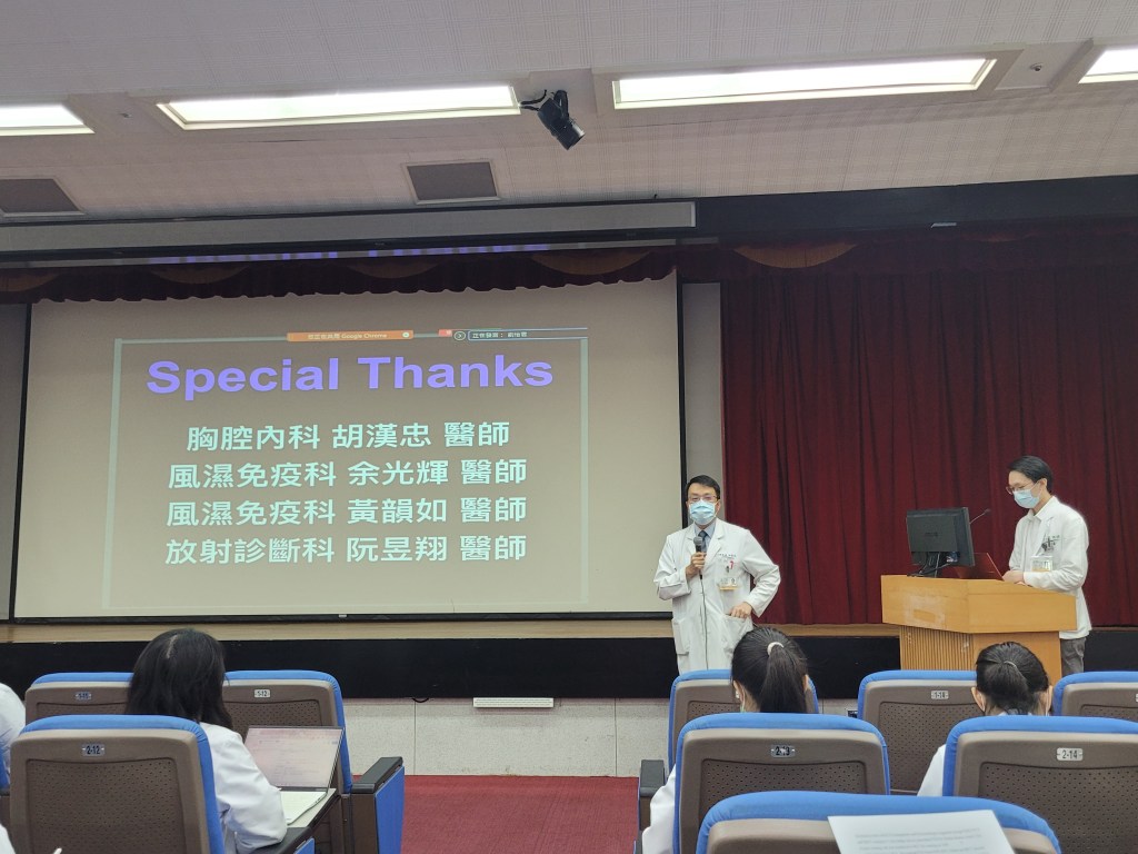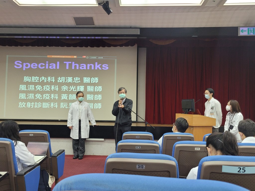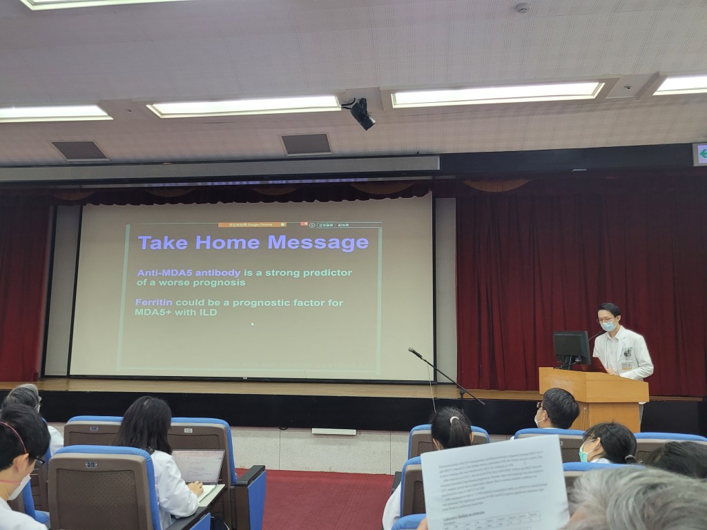 準備的過程中,著實地感謝胡漢忠主任聽了我報告很多次也給了我相當多的回饋,總是以鼓勵的方式讓我們成長、黃韻如醫師也體點了我許多診斷上需要注意的重點,以及其他同樣疾病病人有什麼樣的表現,余光輝主任也在風濕科科內會議對於MDA5疾病提出了相當多精闢的見解,會後的討論回答分享了許多治療的經驗,阮昱翔醫師對於判讀MDA5+ DM ILD的HRCT時,總是能引據日本人的多年經驗,教導我許多較常出現的影像表現,整個準備過程滿懷感激也獲益良多。非常謝謝老師們的教學,也感謝每一位花時間聽講的人。