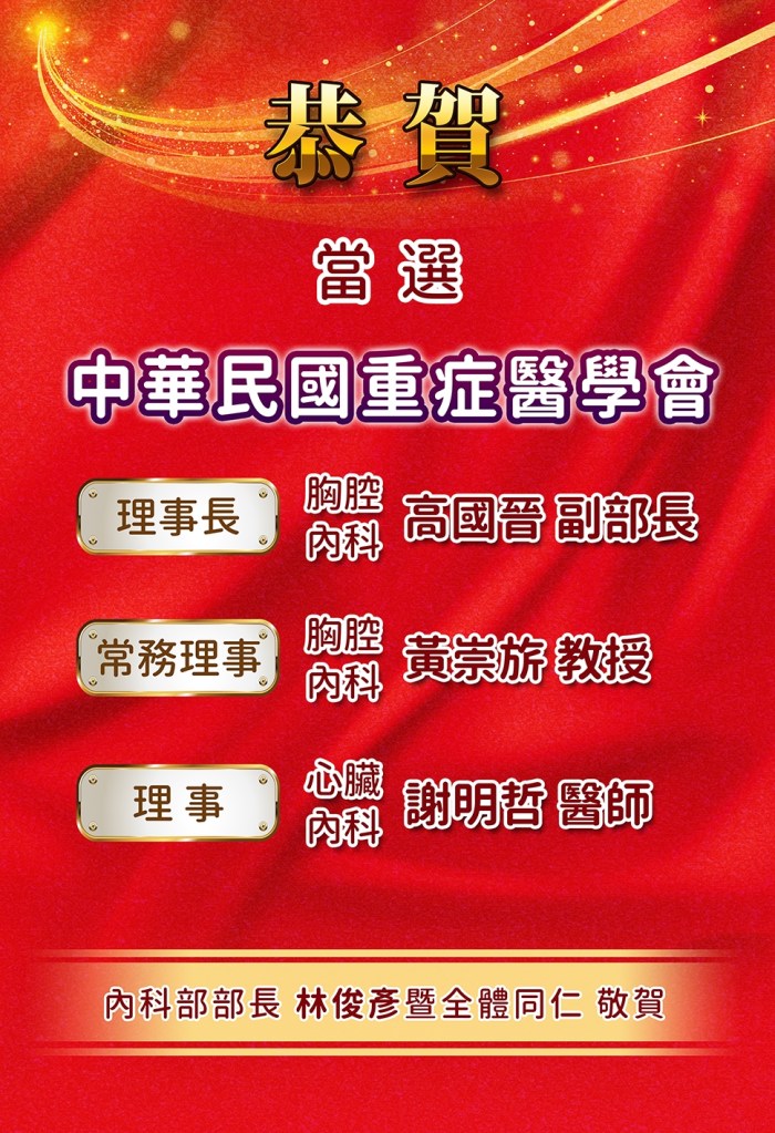 最後,非常歡迎我們林口長庚內科部所有對重症醫學有興趣的醫師,都可以來加入重症醫學會成為會員,特別是PGY或住院醫師或總醫師,也可以加入重症醫學會成為普通會員,大家一同參與學會的教育演講及活動,增進重症醫學的知識,讓我們的重症病人得到更好的照護。