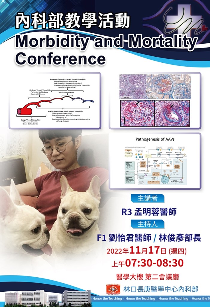 | 11/17(四) 07:30-08:30 第二會議廳 | Morbidity and Mortality Conference R3 孟明蓉 F1 林穎君/ 內科部 林俊彥 部長 | https://cgmh.webex.com/cgmh/j.php?MTID=m4bd1c184424643996a7e029f44bf7043 |
