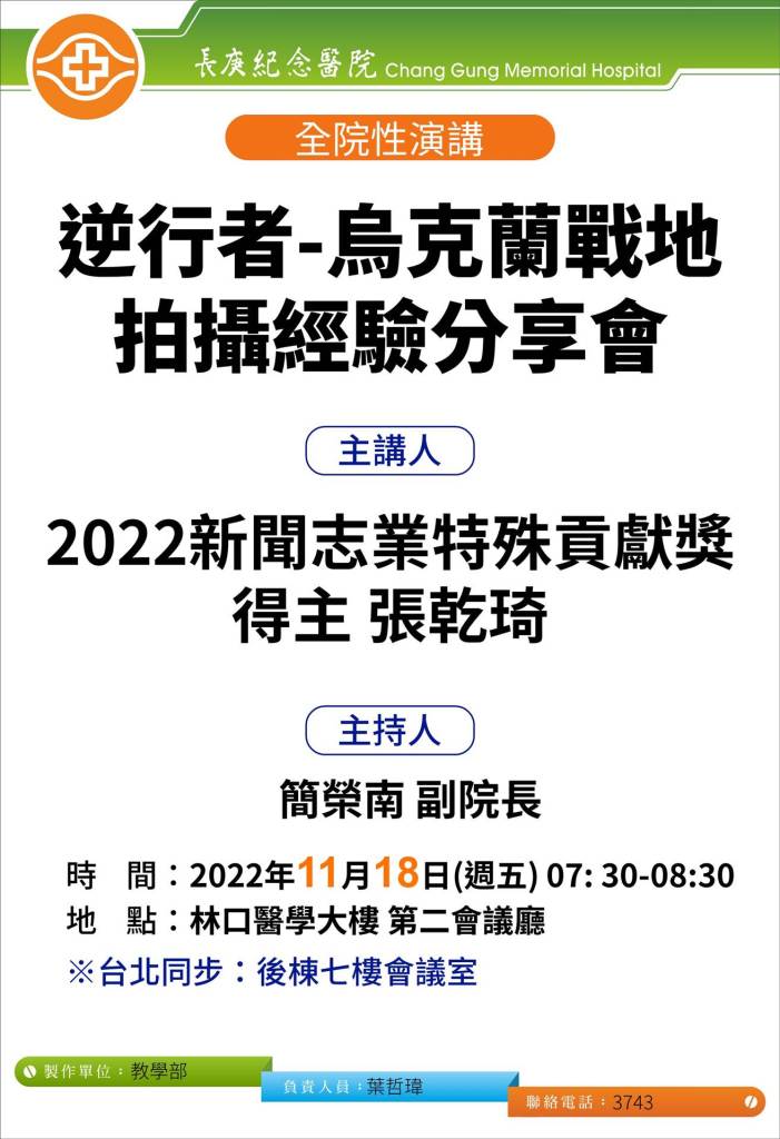| 11/18(五) 07:30-08:30 第二會議廳 | 全院性演講: 逆行者-烏克蘭戰地 拍攝經驗分享會 2022新聞志業特殊貢獻獎得主 張乾琦/ 簡榮南 副院長 | 實體無視訊 |