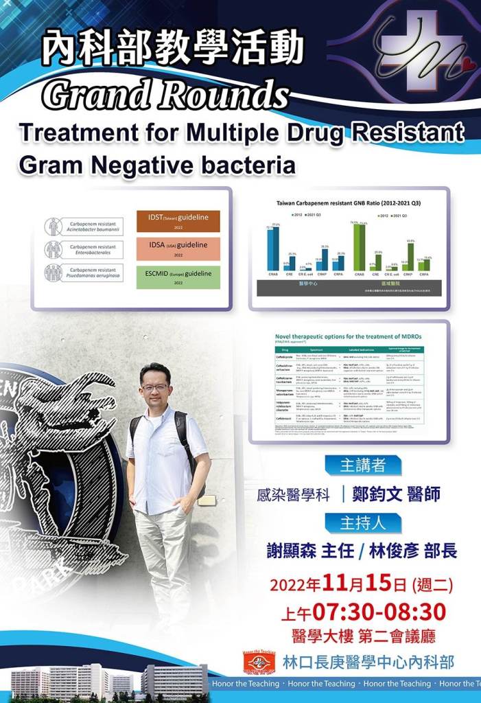 | 11/15(二) 07:30-08:30 第二會議廳 | Grand Round: Treatment for Multi-Drug Resistant Gram Negative Bacteria 感染科 鄭鈞文 醫師/ 內科部 林俊彥 部長 | https://cgmh.webex.com/cgmh/j.php?MTID=mad0042abcc4310f9cd110709fe923ad9 |