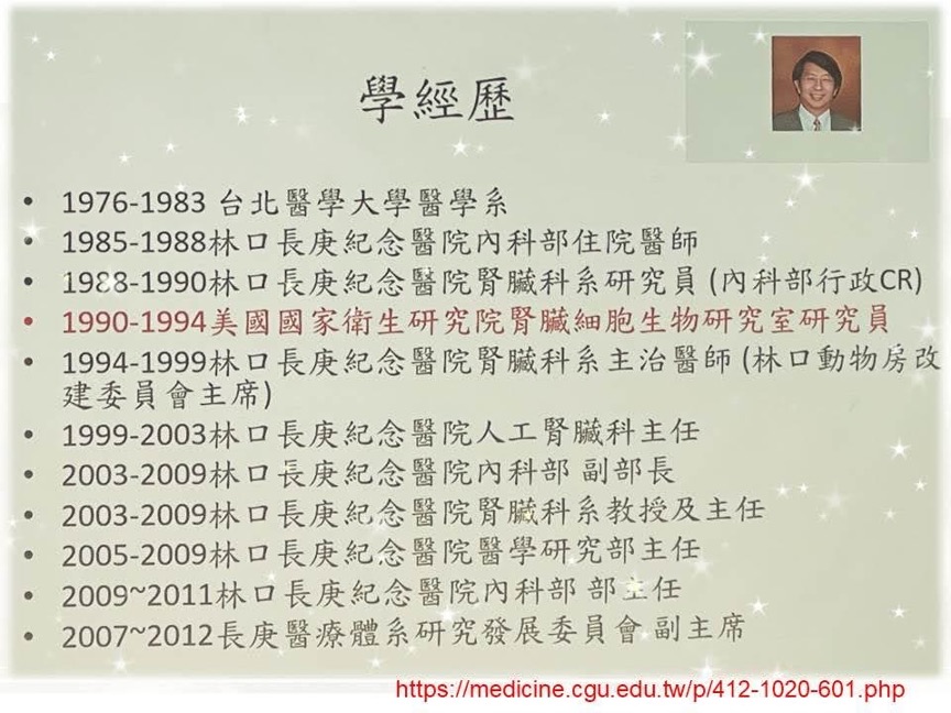 楊副校長是我們腎臟學界的翹楚,看一下楊副校長的學經歷就知道,經過了無數的大風大浪才有我們今天看到的成就,代表了楊副校長一生的心血及奉獻,所以我這次辦活動也是戰戰兢兢、誠惶誠恐,深怕一個做不好毀了大家的興致。