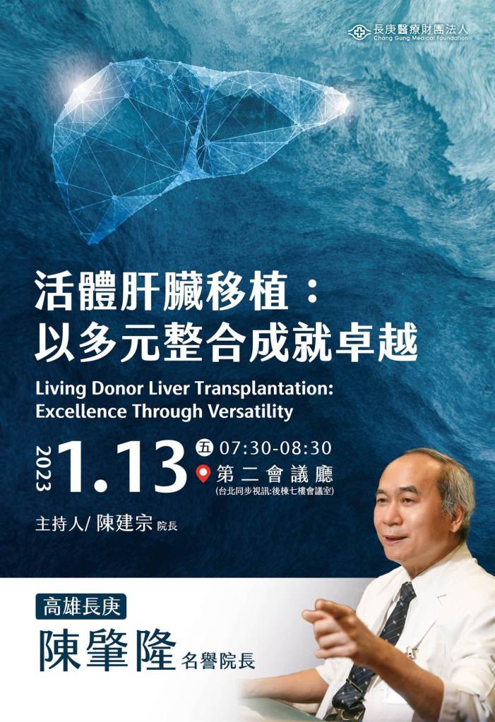 | 1/13(五) 07:30-08:30 第二會議廳 | 全院性演講: Living Donor Liver Transplantation : Excellence Through Versatility 活體肝臟移植: 以多元整合成就卓越 高雄長庚 陳肇隆 名譽院長/ 林口長庚 陳建宗 院長 | 實體無視訊 |