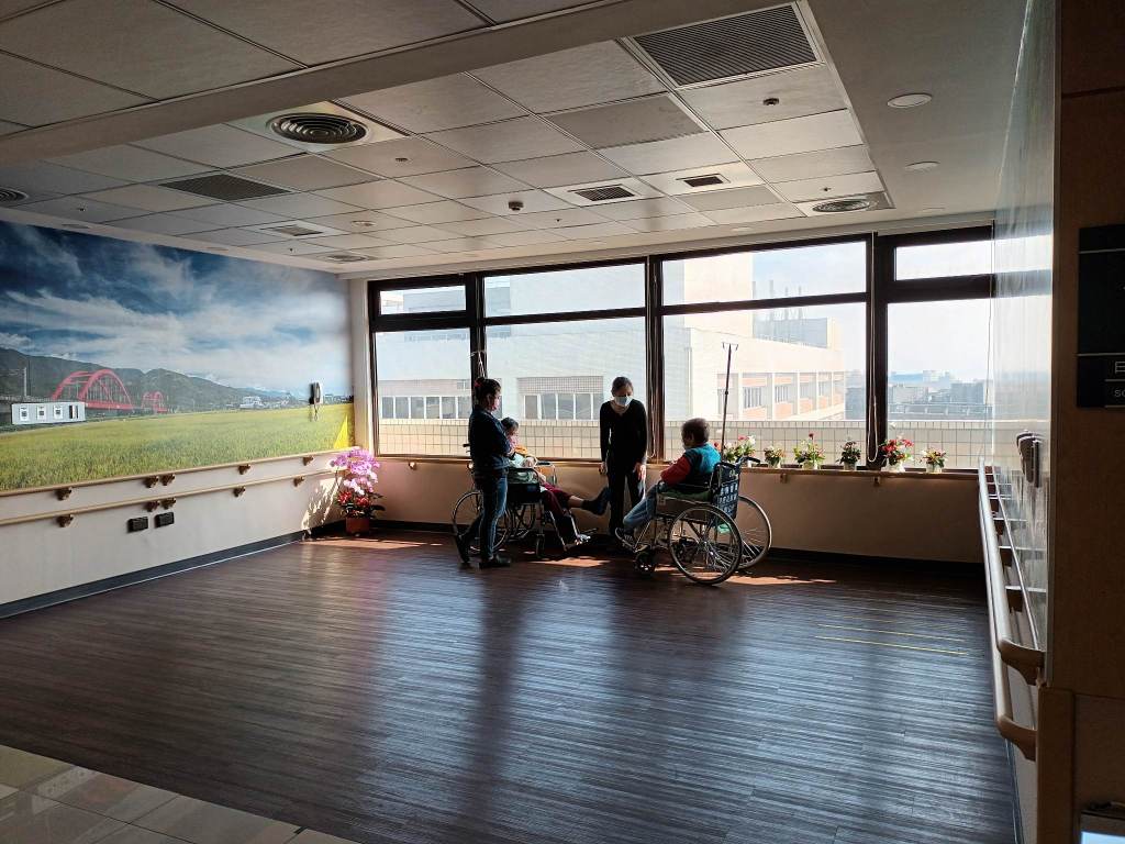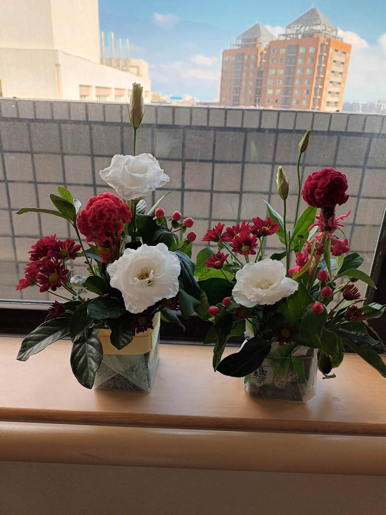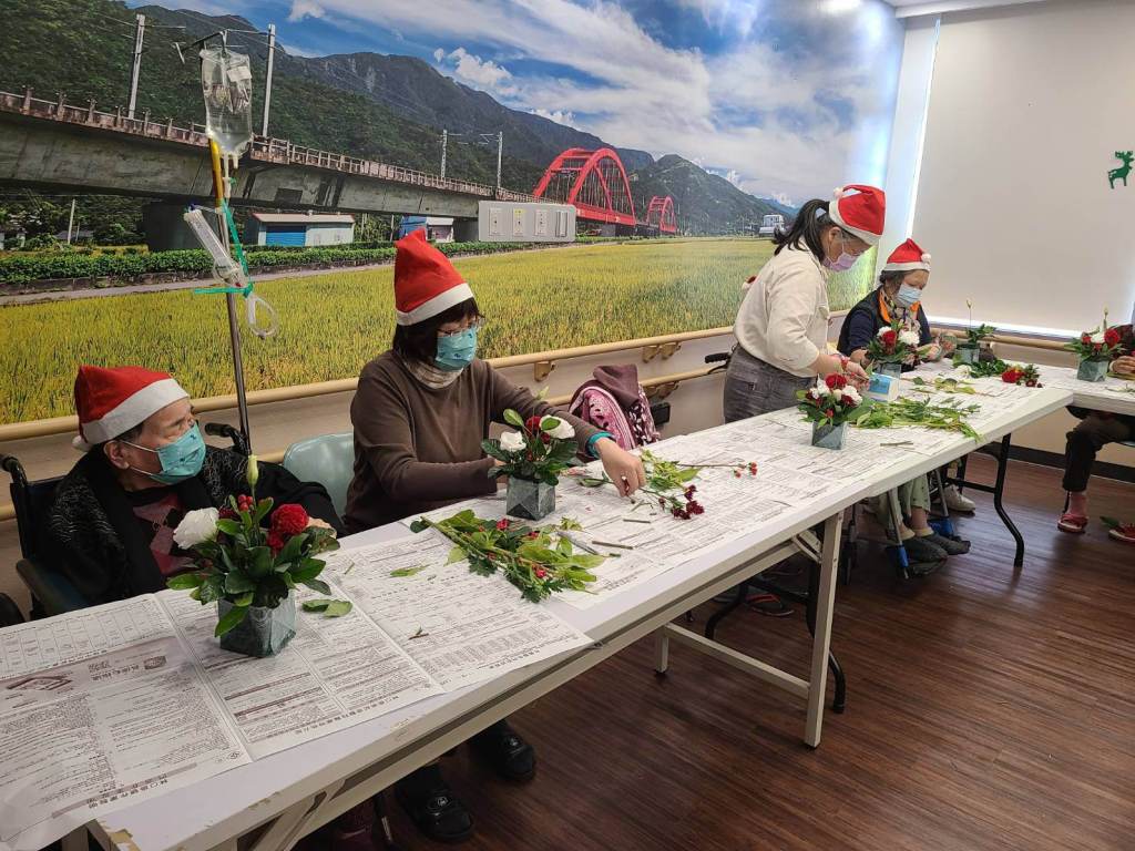 為了讓住院病人能有接觸陽光的機會及活動空間,位於13F的高齡醫學病房,建置了日光室。除了每日11:00的簡易樂活復健,投籃,踩腳踏車,套圈圈,丟沙包,也會不定期舉辦活動,邀請病人及照顧者參加。在歲末年終之際,我們與社工師合作,舉辦「植想陪你,花現幸福」園藝治療紓壓活動,希望能帶給高齡病人及照顧者們歲末年終的祝福。