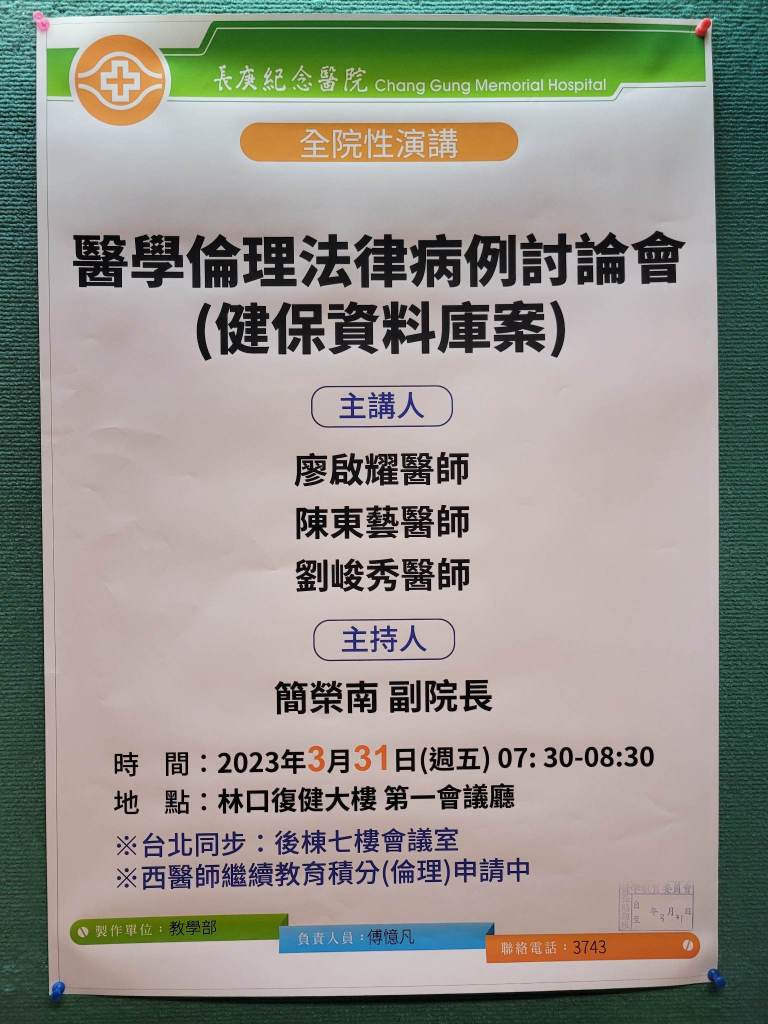 | 3/31(五) 07:30-08:30 第一會議廳 | 全院性演講: 醫學倫理法律病例討論案會(健保資料庫案) 廖啟耀 醫師 陳東藝 醫師 劉峻秀 醫師/ 簡榮南 副院長 | 實體無視訊 (西醫繼續教育積分申請中) |
