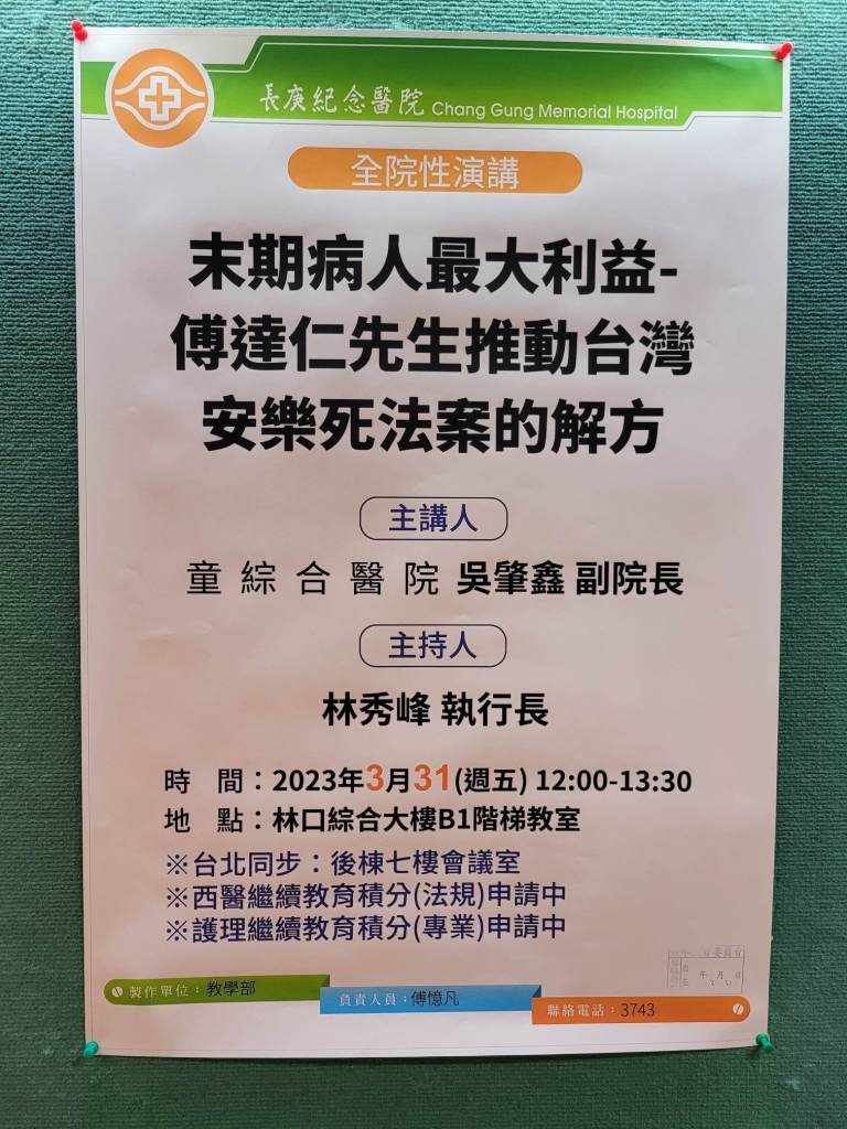 | 3/31(五) 12:00-13:30 綜合大樓B1 階梯教室 | 全院性演講: 末期病人最大利益-傅達仁先生推動台灣安樂死法案的解方 台中童綜合醫院 吳肇鑫 副院長/ 林秀峰 執行長 | 實體無視訊 (西醫繼續教育積分與護理繼續教育積分申請中) |