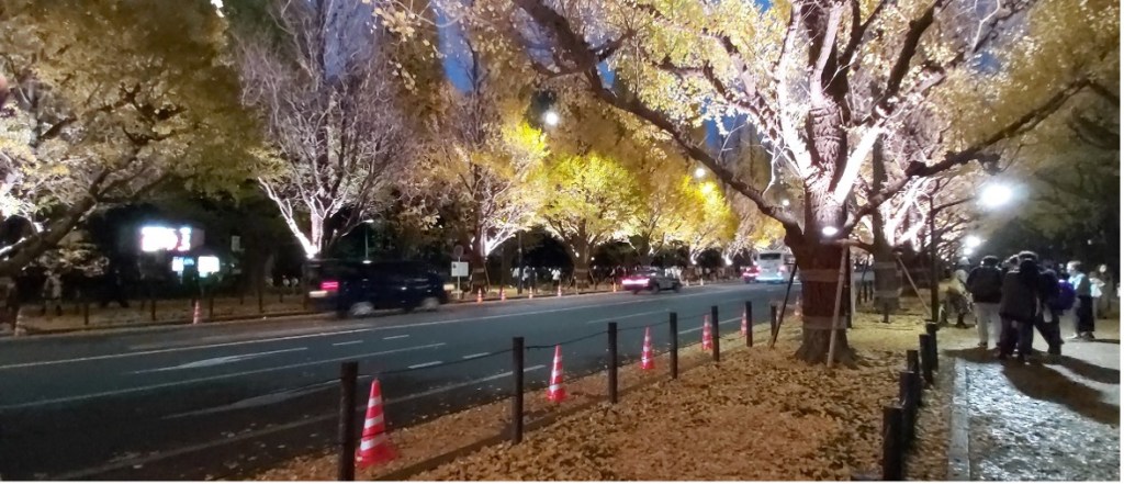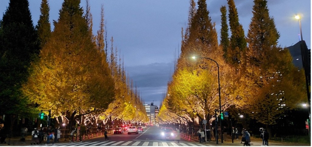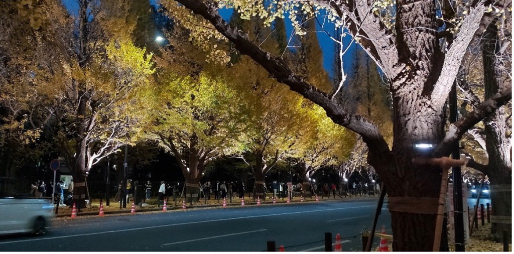 在青山通到聖德紀念繪畫館間約三百公尺的距離因擁有四排壯觀的銀杏樹,經常被取景。太陽下山後甚至會點起燈,成為劃破夜空的燦爛。