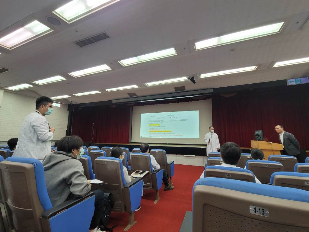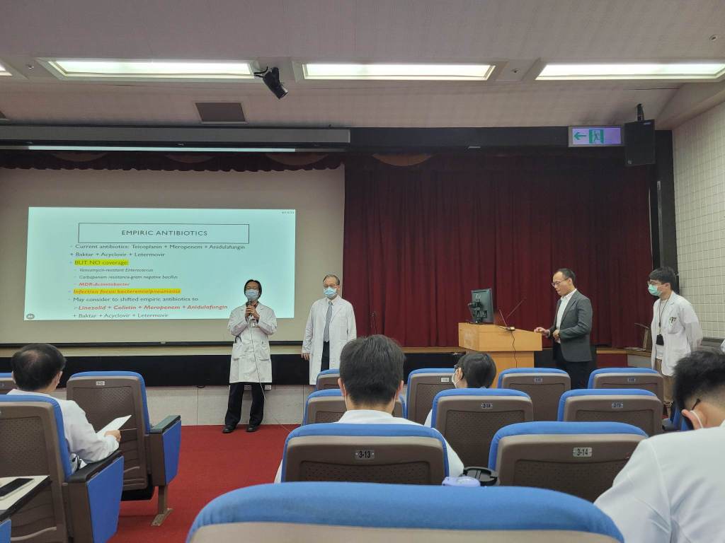 在報告前半個月,在感染科病房碰巧有幸與李明勳醫師討論,想起病人住院直至病人過世間,僅在插管前後僅更換過一次抗生素,這才驚覺也許這是可改善之處。與劉仲淇學姐討論、再請教李明勳醫師過後,得知我們在加護病房常用的經驗抗生素組合可能需要改變;尤其針對免疫極差的病人,在加護病房環境常常長出極具抗藥性的細菌的情形下,更不適合等到培養結果出來才調整。我十分感謝李明勳醫師跟劉仲淇學姐給我許多關於抗生素的指導跟討論。