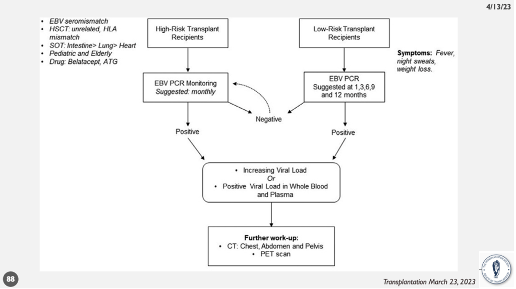 總結,PTLD是在免疫功能降低的情況下發生的淋巴腫瘤,與EBV感染密切相關。為了有效篩選風險和治療,我們需要密切關注患者的危險因素和血中EBV DNA的變化。對於高風險患者,我們應該加強監測,並在適當時候進行搶先治療,以降低PTLD的發生風險。對於已確診的患者,則需要採取適當的治療措施,如減少免疫抑制劑、使用莫須瘤(rituximab),甚至進行化療。緊密監測和及時治療對於提高患者預後至關重要。