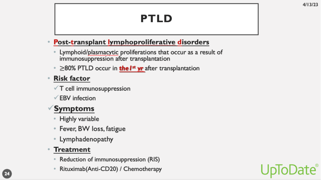 所謂PTLD,全名為移植後淋巴增生性疾病。簡單來說,PTLD是在免疫功能低下情況下出現的淋巴腫瘤。移植後為避免排斥反應,我們給病人使用免疫抑制劑,導致病人免疫功能下降,此時出現的淋巴腫瘤稱為PTLD。PTLD通常在移植後第一年內發生,危險因子主要包括EBV感染和T細胞抑制程度。症狀多樣,但常見的為B症狀,如發燒、體重減輕、疲憊和淋巴結腫大。最重要的治療是搶先治療(在EBV病毒量上升時提前治療以避免PTLD的產生),包括減少免疫抑制劑或停用,以及使用莫須瘤(rituximab)。若以上方法無效,確定為惡性細胞時需使用化療。