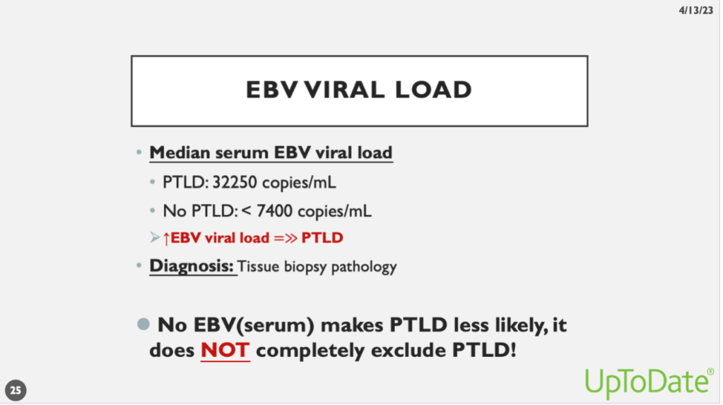 PTLD與EBV具有高度相關性。PTLD患者的血液中EBV病毒量平均可達每毫升32,000 copies,而確定無PTLD的患者平均為每毫升7,400 copies以下。注意,這些數字並非絕對,只是給大家一個概念:多高的EBV病毒量可能意味著要警惕PTLD的發生。PTLD的確診仍需病理切片。此外,血液中未檢出EBV並不能排除PTLD,因為也存在EBV陰性的PTLD。
