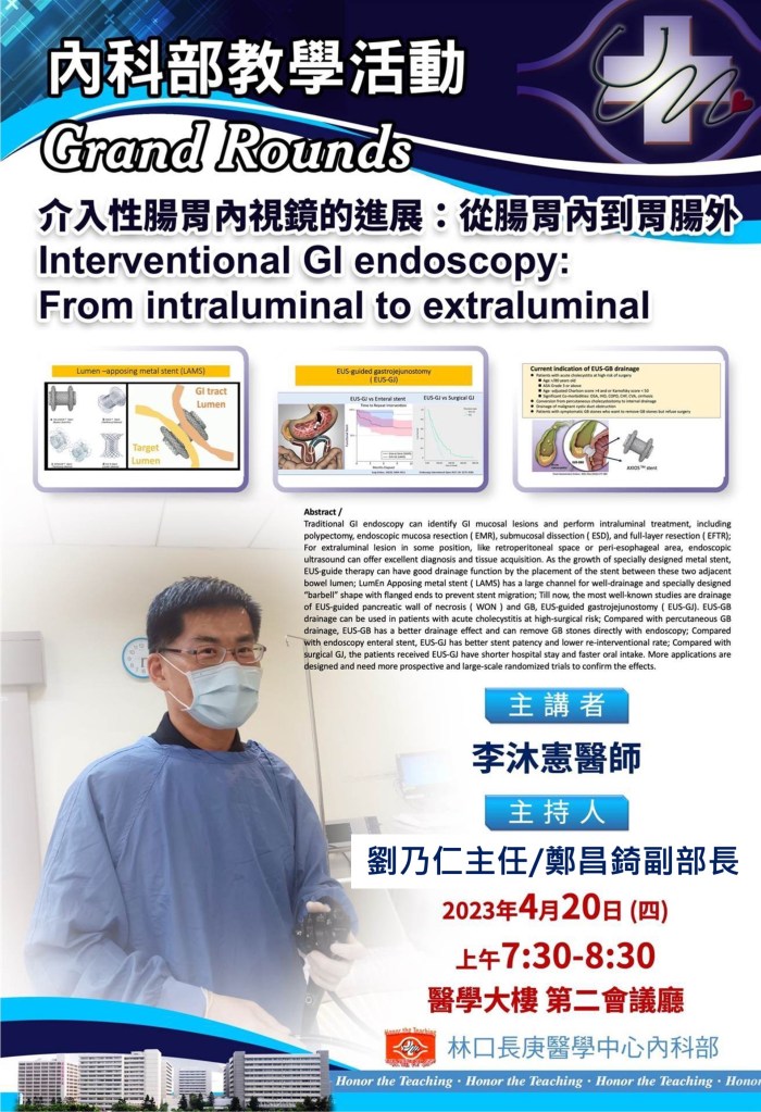 | 4/20(四) 07:30-08:30 第二會議廳 | Grand Rounds: 介入性腸胃內視鏡的進展:從腸胃內到胃腸外 Interventional GI endoscopy: From intraluminal to extraluminal 胃腸肝膽科 李沐憲 醫師/ 劉乃仁 主任 鄭昌錡 副部長 | https://cgmh.webex.com/cgmh/j.php?MTID=me722cdd9e85bf1be2cd5aad8214b3a24 |
