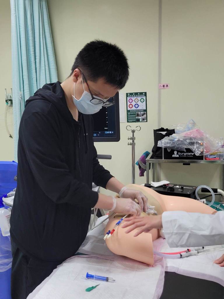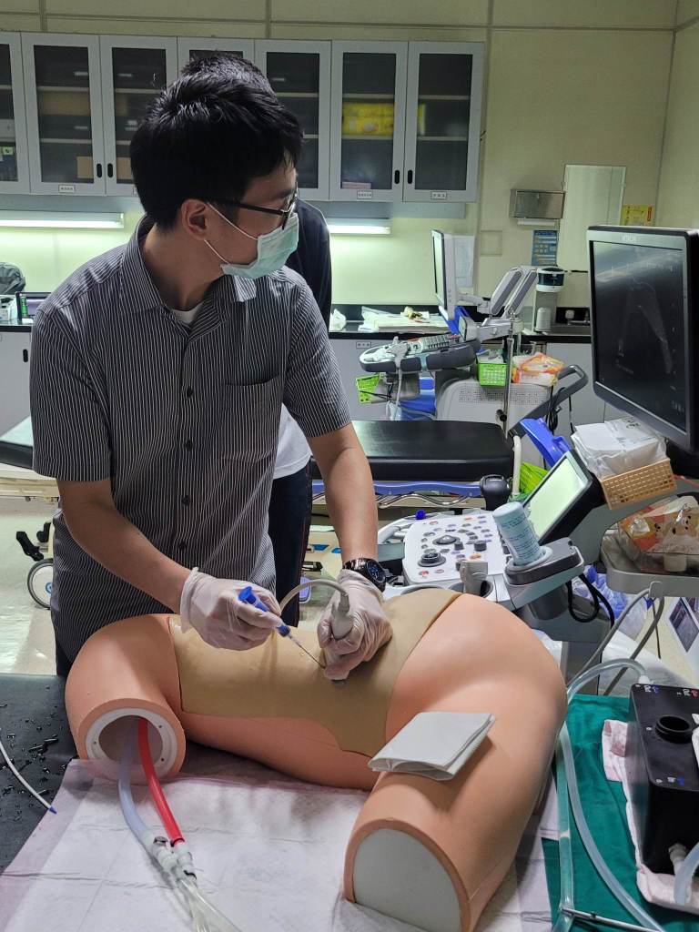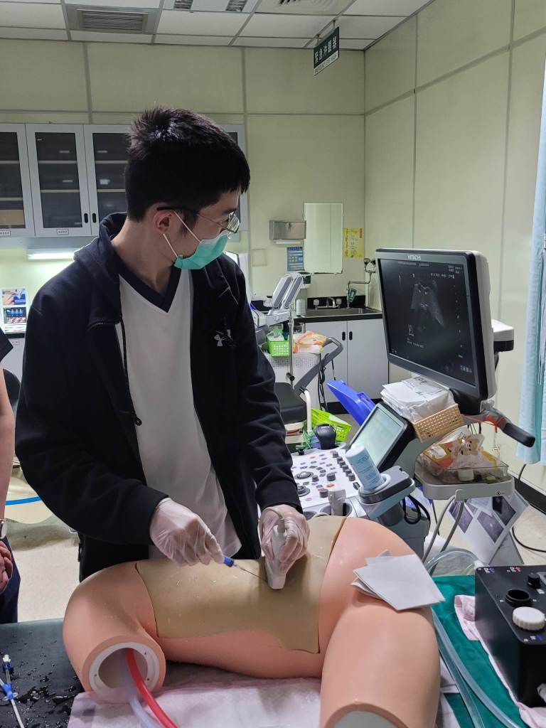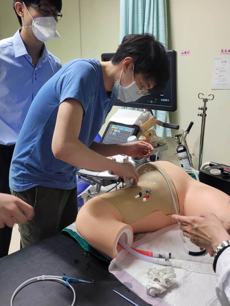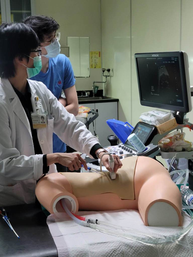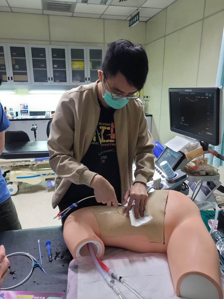 下午的課程是密集的超音波導引double lumen實作體驗,每個人都會在老師的協助下透過超音波對模擬假人(動脈真的會有pulse的假人)real time的施打double lumen。這個經驗對我來說彌足珍貴,記得之前在clerk的時候,就不時遇到學長姐打CVC不太順,不僅操作時間過長,不斷嘗試可能也增加併發症的風險。各種導管置入本身就是一個風險不低的處置,我很幸運能在學長的指導下成功施打CVC,但要我自己來,內心還是會害怕,把病人當作練習感覺也對病人非常不好意思。有了假人模擬的經驗和學會超音波的使用,我相信對每個人未來要打各種導管,無論有沒有超音波的協助,都有非常大的幫助!!