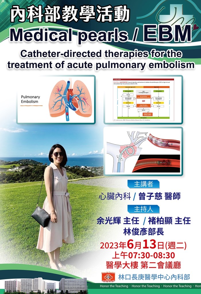 | 6/13(二) 07:30-08:30 第二會議廳 | Medical Pearls/EBM: Catheter-directed therapies for the treatment of acute pulmonary embolism 心臟內科 曾子慈 醫師/ 余光輝 主任 褚柏顯 主任 林俊彥 部長 | https://cgmh.webex.com/cgmh/j.php?MTID=me28f666735c583c45353cf12bb1d8b90 |