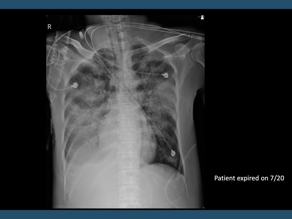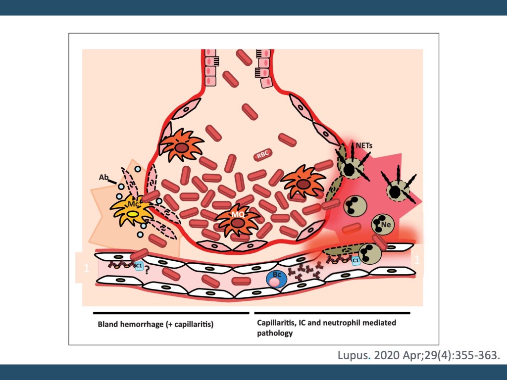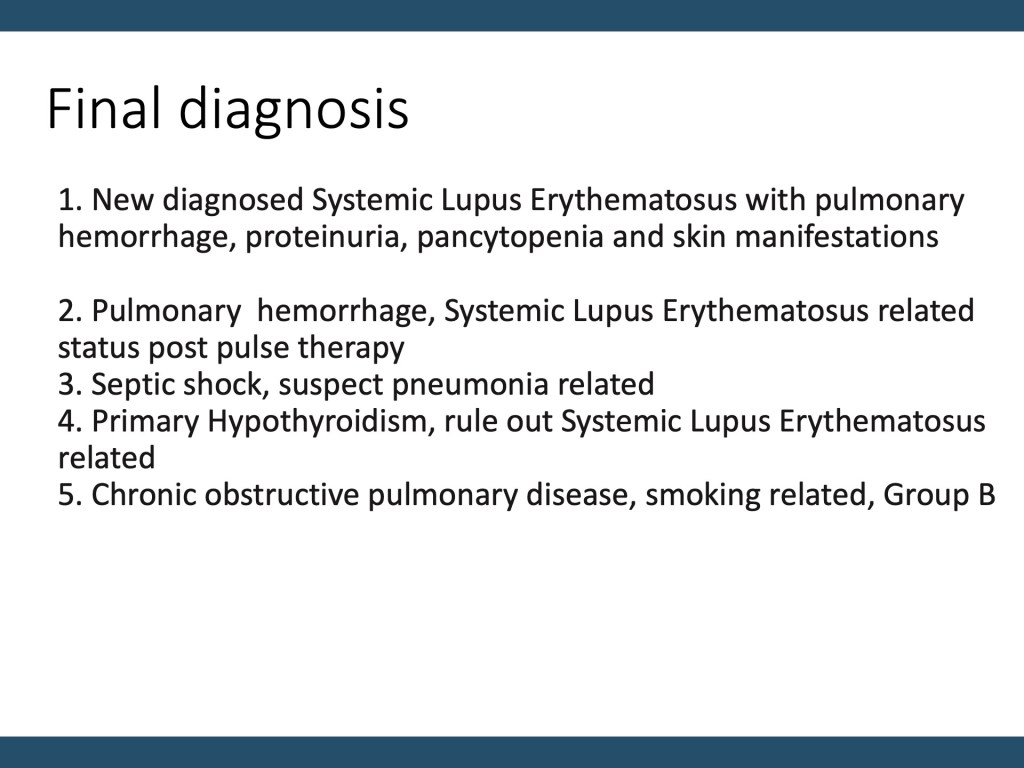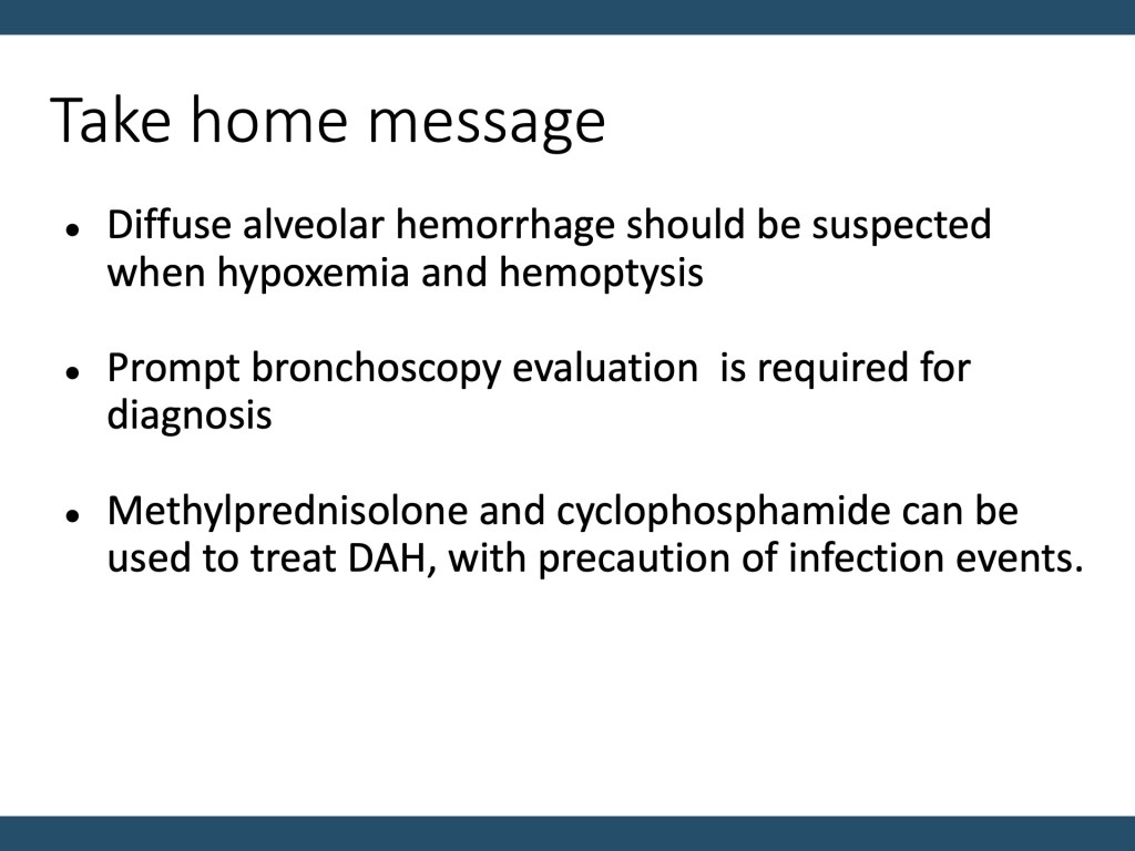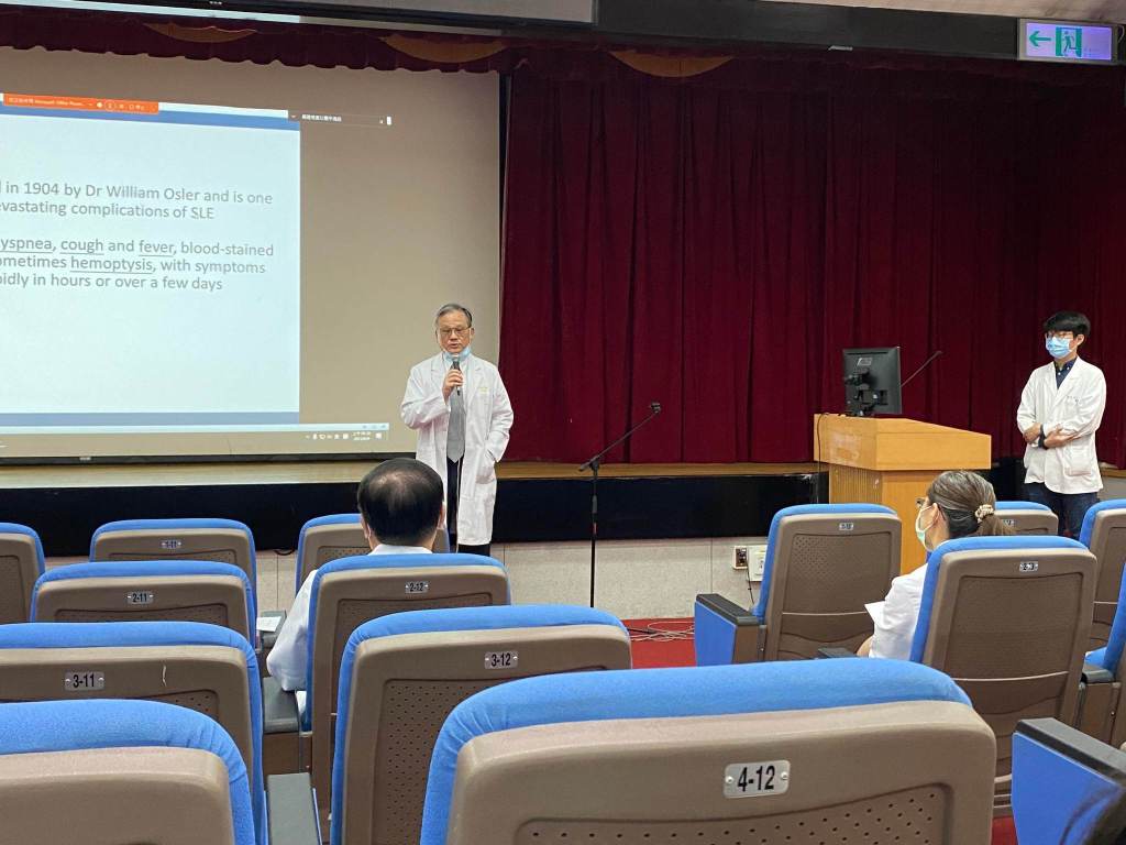 這次報告的case是一個中年男性,在這次住院新診斷紅斑性狼瘡然而在住院檢查的過程中開始出現罕見病發症。病人開始出現喘以及咳血的情形,X 光出現新的浸潤,後來咳血狀況惡化,插管後做支氣管鏡診斷了瀰漫性肺泡出血。然而在治療後病人的肺出血狀況沒有改善,並且很快出現敗血性休克而過世。
