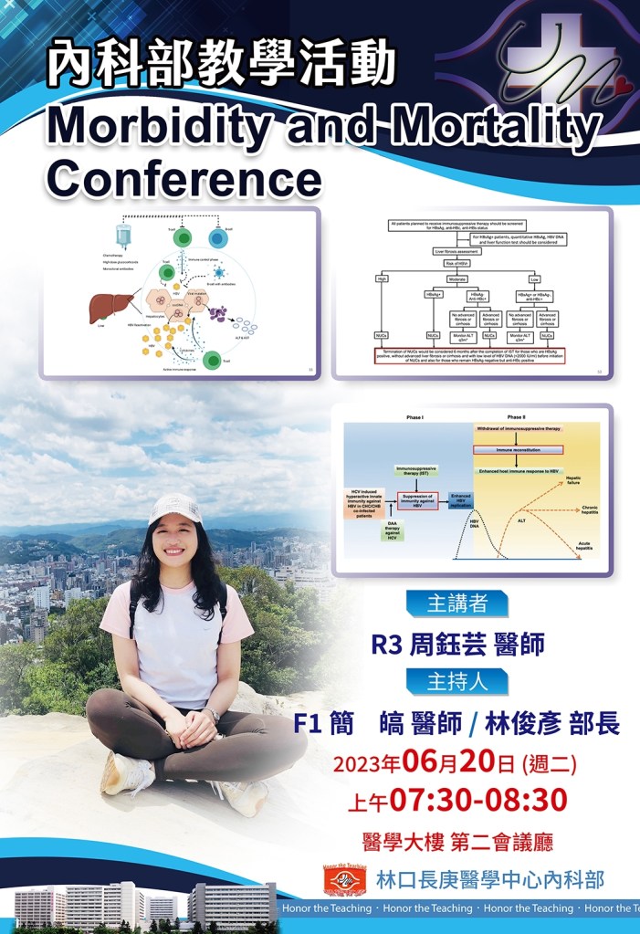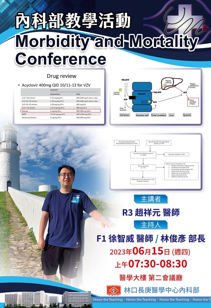| 6/15(四) 07:30-08:30 第二會議廳 | Morbidity and Mortality Conference R3 趙祥元 F1 徐智威/ 林俊彥 部長 | https://cgmh.webex.com/cgmh/j.php?MTID=mb8f82ad461839d5cf17e4ad3b375a740 |