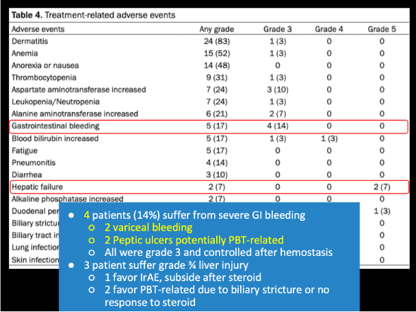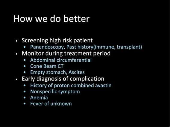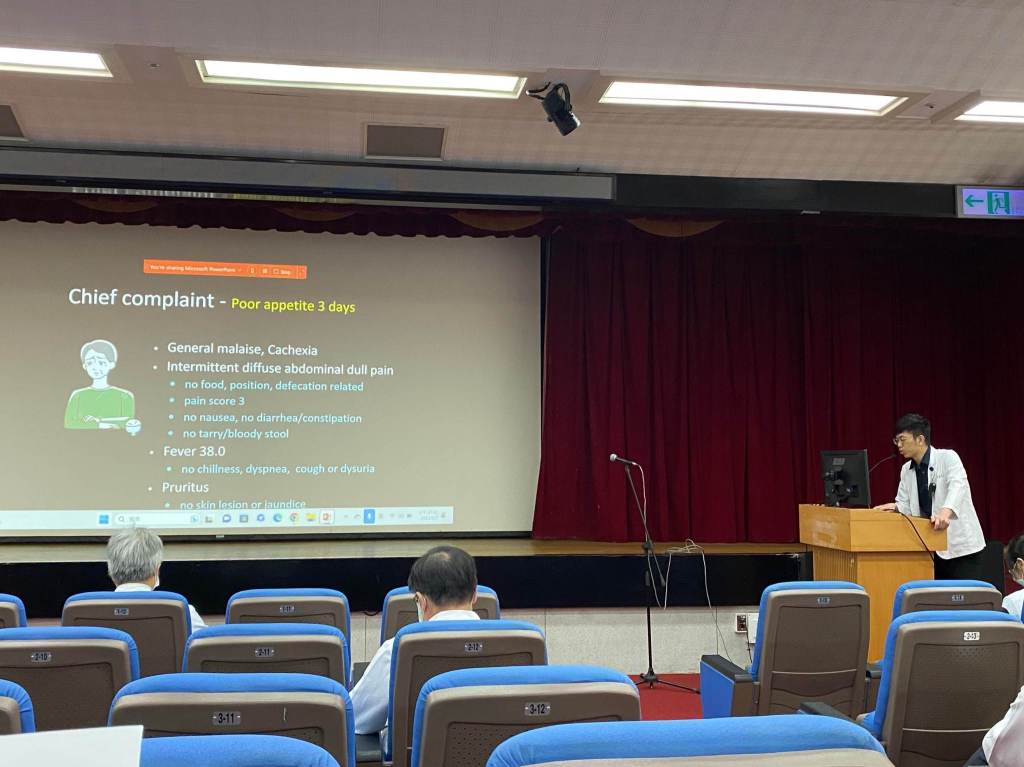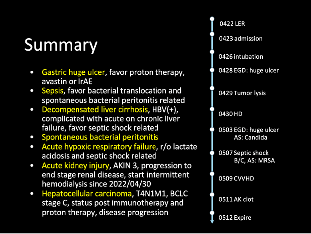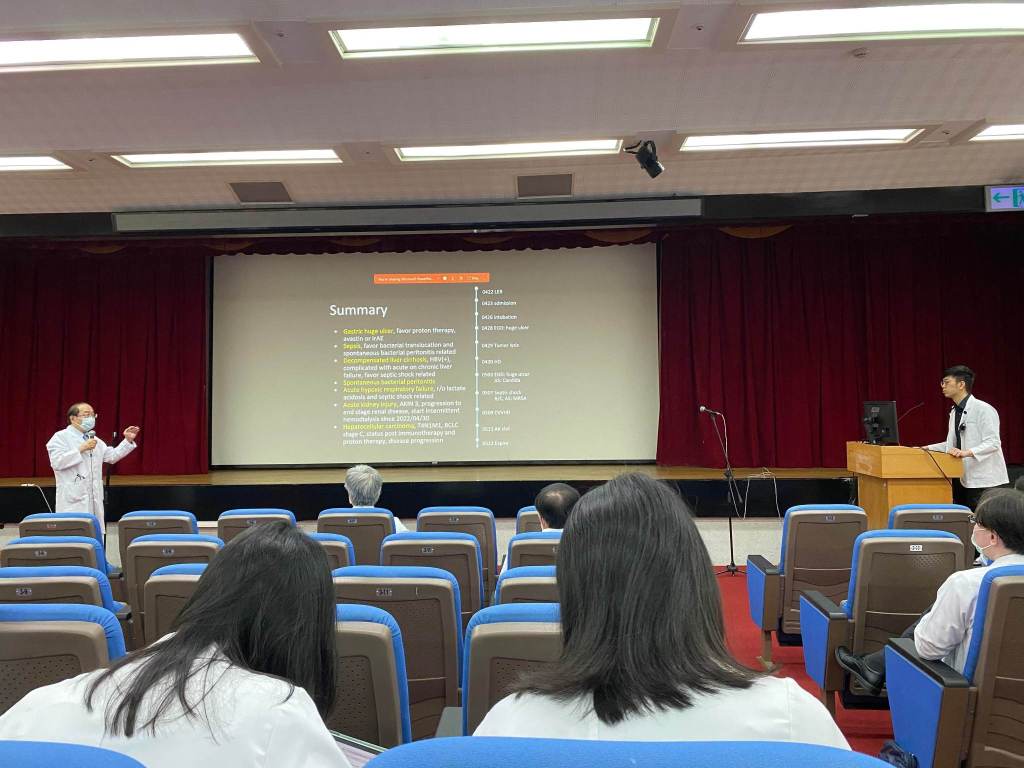 本次報告主題是Proton therapy gastritis,特別感謝腸胃科陳威廷醫師和放射腫瘤科黃炳盛醫師的協助,在準備報告的過程中,提供明確的方向,也從中學習到很多知識。本次選擇的案例是肝癌第四期的病人,在接受免疫和質子治療後,因爲反覆上消化道出血和敗血症住進腸胃科加護病房,最後因爲反覆的感染與休克,走向肝臟衰竭。免疫合併質子治療,是較新的治療方式,且需要病人高額自費,因此能夠找到的文獻不多,台灣的經驗也有限,希望透過這次報告的準備,了解相關的治療,也為之後的次專科訓練有所提升。