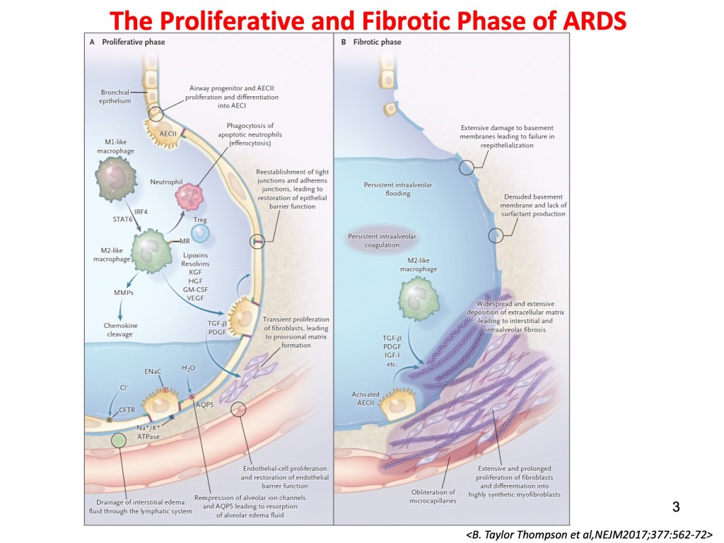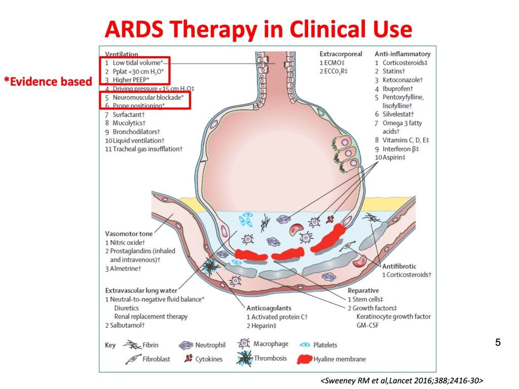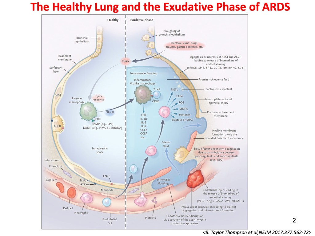 急性呼吸窘迫症候群(acute respiratory distress syndrome, ARDS)是由諸多危險因子造成,約85%為肺炎,吸入性肺炎和敗血症。ARDS致病機轉複雜,以嗜中性球為主要細胞,誘發一連串發炎反應及免疫系統活化,上皮細胞和內皮細胞損傷,肺泡發炎滲液蓄積,導致嚴重低血氧,需要使用呼吸器支持。嚴重個案甚至併發多重器官衰竭而死亡,死亡率接近五成。