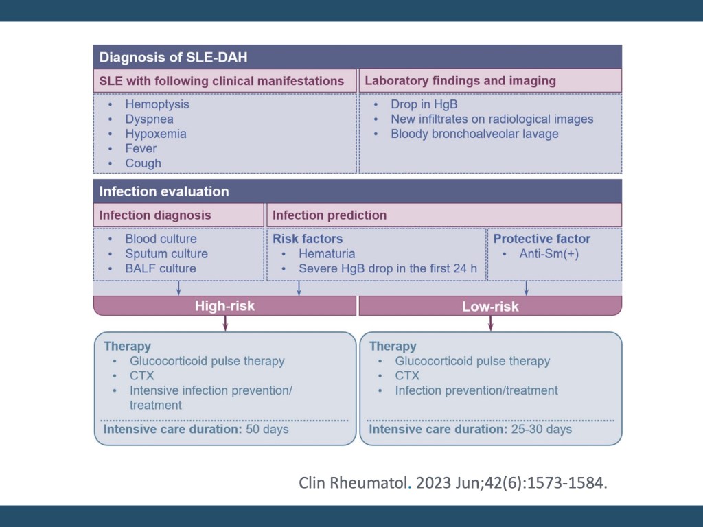 瀰漫性肺泡出血(diffuse alveolar hemorrhage)是紅斑性狼瘡少見嚴重併發症之一,有極高的致死率。目前對於他的病理機轉不是很了解,但可以從病理切面上進行簡單的分類。在紅斑性狼瘡病人相關的瀰漫性肺泡出血可以使用methylprednisolone以及cyclophosphamide治療,但在治療瀰漫性肺出血的同時需要注意可能的感染。
