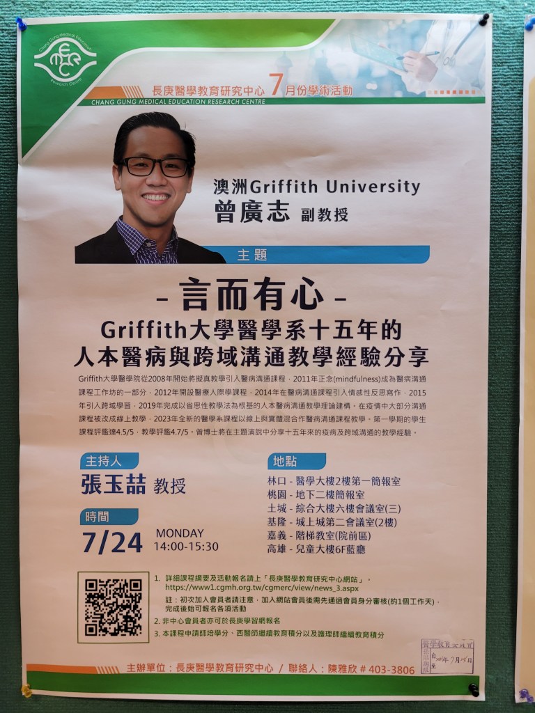 | 7/24(一) 14:00-15:30 醫學大樓二樓 第一簡報室 | 推薦活動: 醫教研究中心 言而有心–Griffith大學醫學系十五年的人本醫病與跨域溝通教學經驗分享 澳洲Griffith University 曾廣志 副教授 | 實體無視訊 |