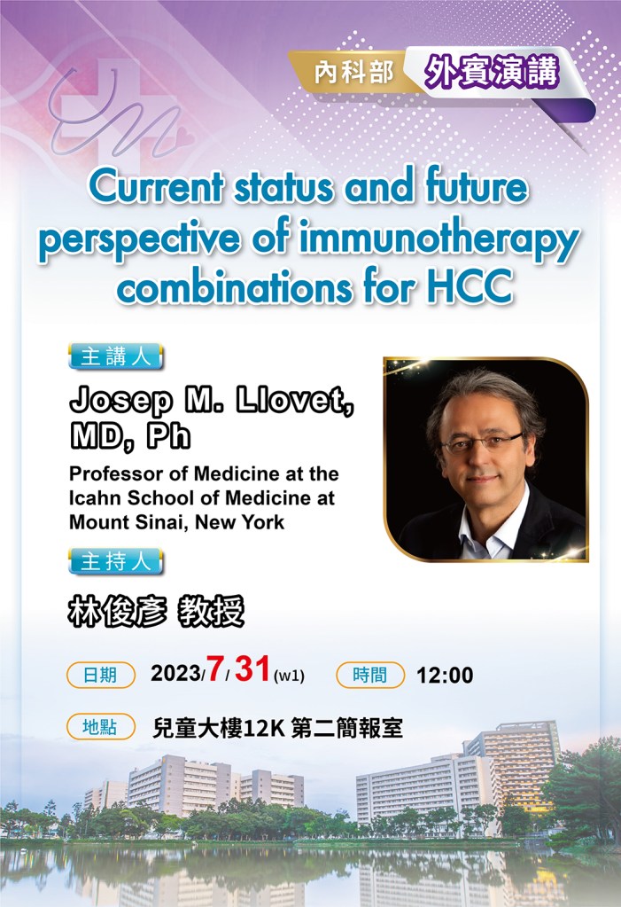 | 7/31(一) 12:00 兒童大樓12K 第二簡報室 | 內科部外賓演講:Current Status and future perspective of immunotherapy combination for HCC Professor of Medicine at the Icahn School of Medicine at Mount Sinai, New York Josep M. Llovet/ 林俊彥 教授 | 實體無視訊 |