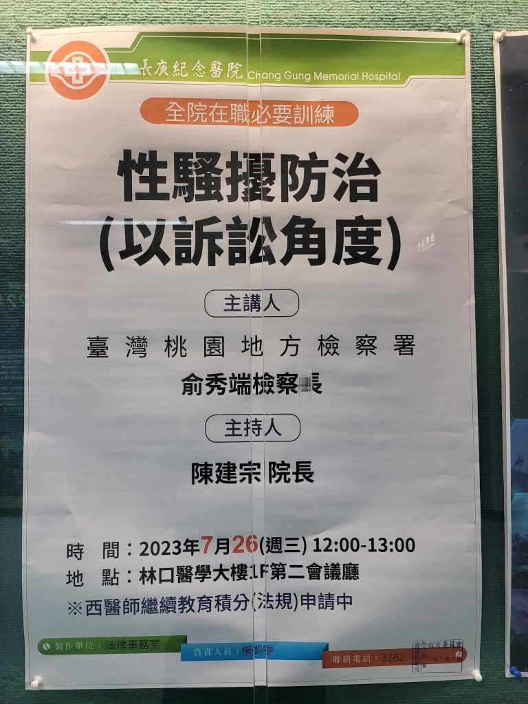 | 7/26(三) 12:00-13:00 第二會議廳 | 全院在職必要訓練: 性騷擾防治(以訴訟角度) 臺灣桃園地方檢察署 俞秀端 檢察長/ 陳建宗 院長 | 實體無視訊 (西醫師繼續教育積分申請中) |