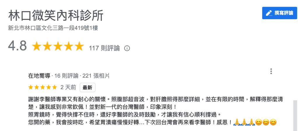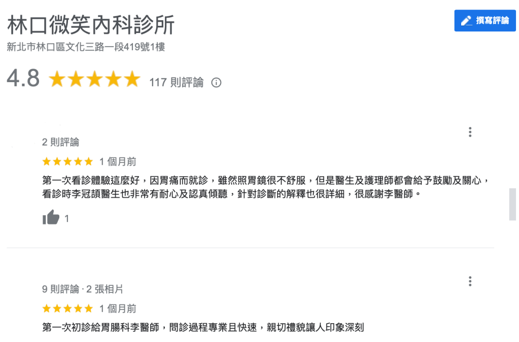 甚至有患者說聽到我聲音就放心了……我在想可能是我把每一位患者都當作主任、老師、跟院長來伺候吧。(附上冰山一角的google評論,聽說民眾很吃這一套!!)