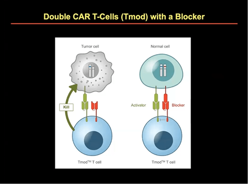 如何將細胞治療運用在實體腫瘤上是另個挑戰,要設計只攻擊實體腫瘤而不攻擊正常組織、到達腫瘤所在位置、對抗腫瘤微環境的細胞。但科學家沒有因此大喊:阿姨我不想努力了。轉而利用innate immune system中的NK/T cell,或是設計出Double CART (Tmod),找出腫瘤細胞上沒有的標記當作是blocker。因此Double CART細胞可以只殺掉腫瘤細胞,而不會殺掉正常細胞。目前已有臨床試驗進行中。