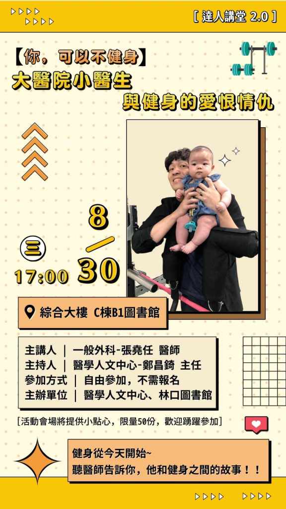 | 8/30(三) 17:00 綜合大樓C棟B1 圖書館 | 推薦活動: 達人講堂2.0– 【你,可以不健身】大醫院小醫生與健身的愛恨情仇 一般外科 張堯任 醫師/ 醫學人文中心 鄭昌錡 主任 | 實體無視訊 |