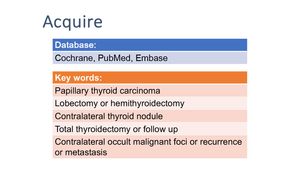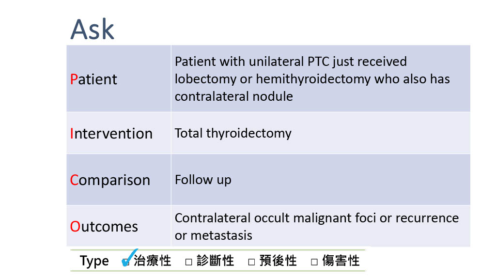 藉由Evidence based medicine (EBM) 搜尋文獻,我們可以依據這樣的情況進行回答。首先進行不同資料庫的搜尋,進行系統性文獻回顧,收集相關的臨床試驗和研究報告,以獲取最新且具有高品質的證據。接著,我們會對這些證據進行評估和分析,以了解手術切除另一側甲狀腺是否能降低病人癌症復發及轉移的風險。