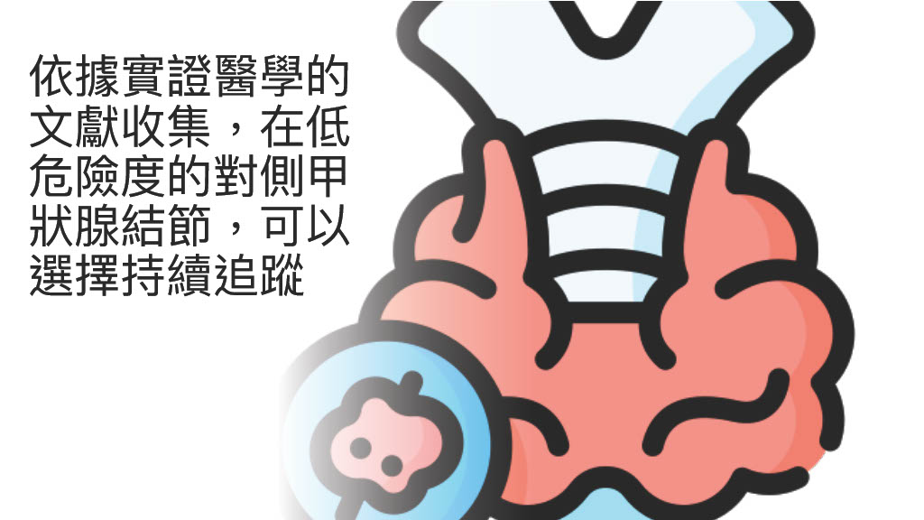 一位49歲男性,在耳鼻喉科追蹤甲狀腺結節,將左側甲狀腺切除後,意外發現甲狀腺乳突狀微小細胞癌,轉介至新陳代謝科接受後續追蹤.因另一側也有結節,病人擔心癌症復發及轉移的風險,故在門診提出疑問:是否需要將另一側的甲狀腺也切除比較安全?