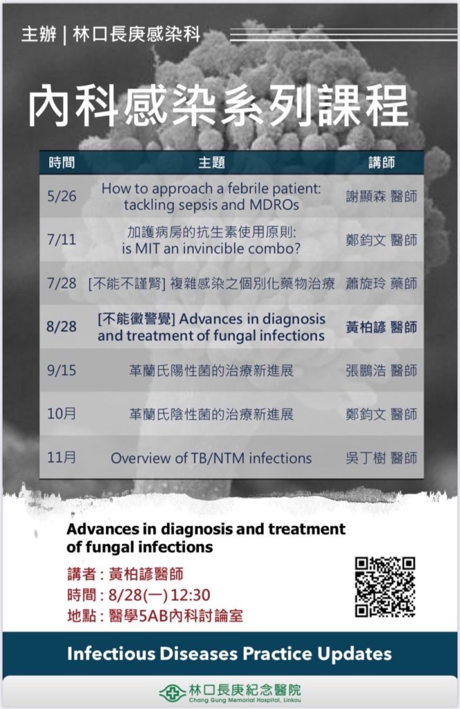 | 8/28(一) 12:30 內科5AB會議室 | 內科感染系列課程: [不能黴警覺] Advances in Diagnosis and Treatment of Fungal Infections 感染科 黃柏諺 醫師 | https://cgmh.webex.com/cgmh/j.php?MTID=m832bc36076593eacd972a49773a0e7f5 |