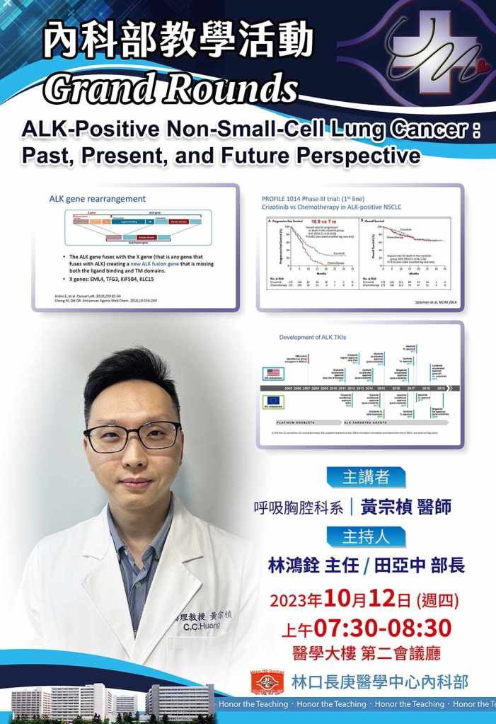 | 10/12(四) 07:30-08:30 第二會議廳 | Grand Rounds: ALK-Positive Non-Small-Cell Lung Cancer: Past, Present, and Future Perspective 呼吸胸腔科系 黃宗楨 醫師/ 林鴻銓 主任 田亞中 部長 | https://cgmh.webex.com/cgmh/j.php?MTID=md82c261942e6e66aca6a097f1271565d |