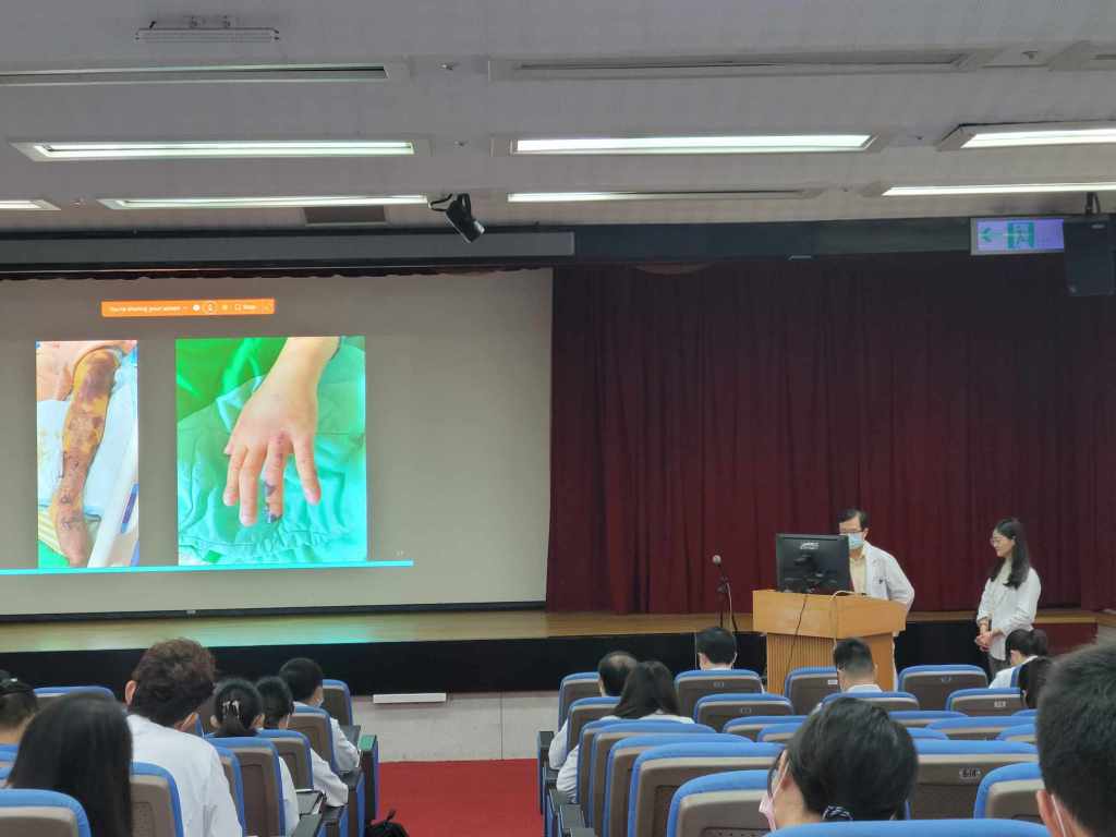 幸運的是,後續用了Plasma exchange治療cytokine storm,才讓病人慢慢穩定下來順利拔管。直到後續病人的皮膚及腎臟切片結果出來後,發現是大量hemoglobin沉積和血栓形成,及臨床上的溶血狀況,review一些文獻後,才知道他是罕見的AOSD with DIC complication。雖然過程中在迷霧中前進,邊走邊看,怕病人再次collapse的感覺是緊張的,但很謝謝老師們的強大而寶貴意見,病人才能脫離險境。最後病人雖然肢體末端小血管因為thrombosis而ischemia無法復原,但腎功能已回復,看著他從被CPR,到可以好好出院,真是太感動了!