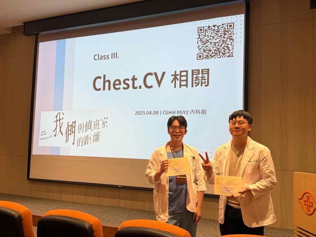 另外,也特別感謝腫瘤科F1謝其霖學長,在準備報告的過程中給予許多建議,包含presentation的細節及技巧、時間如何分配、data如何呈現等等,甚至一頁頁投影片和我討論如何修改會更好,由衷感謝二位醫師的大力幫忙,我才能順利完成報告。
