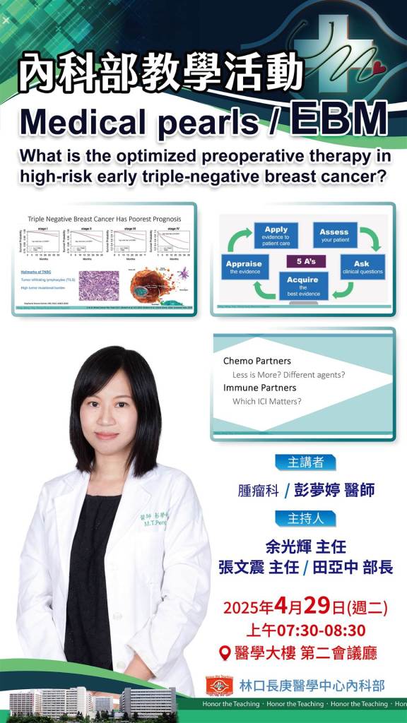 | 4/29 (二) 07:30-08:30 醫學大樓 第二會議廳 | Medical Pearls / EBM 腫瘤科 彭夢婷 醫師/ 余光輝 主任 張文震 主任 田亞中 部長 | 實體無視訊 |