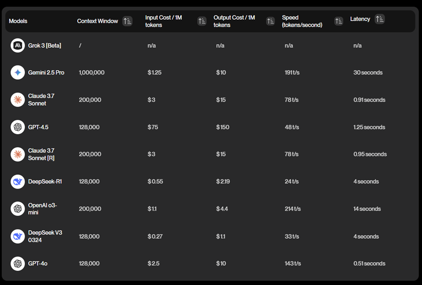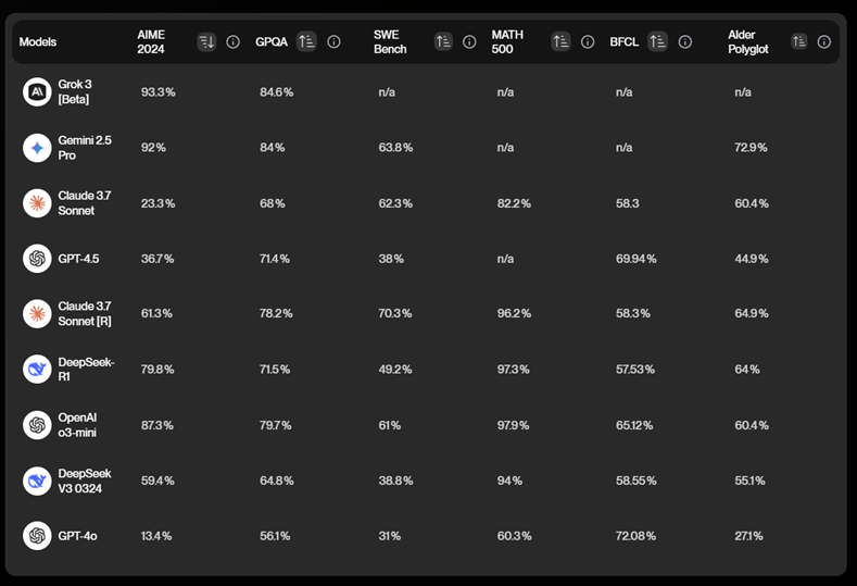 Gemini 2.5主打深度推理與數理能力,在多項基準測試上超越 GPT-4。Grok 3則在AIME(數學競賽)和 GPQA(博士級理科問答)等難度極高的題目上表現傑出。Claude 3.7 Sonnet 則是在邏輯推理能力(如 MMLU)、程式能力(如 SWE Bench)方面屢創新高,特別擅長長篇內容與結構清晰的說明。
