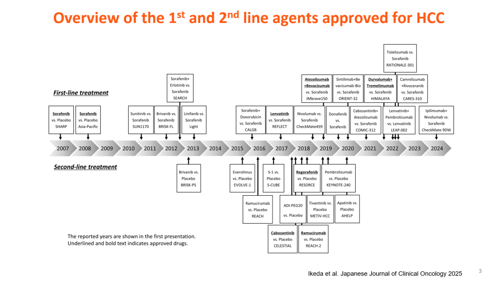 另外目前有許多臨床試驗在各個肝癌期別正在進行中,比如在早期肝癌患者接受根除性治療後給予一年免疫藥物治療,發現可以有效降低腫瘤早期復發率 (如IMbrave050 trial),可惜在後續長時間追蹤發現有無給藥兩組復發存活率沒有明顯差異,在中期肝癌患者腫瘤太多顆合併多處肝臟侵犯不適合接受經動脈化學藥物栓塞,給予免疫藥物治療後再給予經動脈化學藥物栓塞明顯達到比較好的存活率 (如EMERALD-1 trial),免疫藥物已逐漸改變目前肝癌治療指引,期望達到更好的存活率。