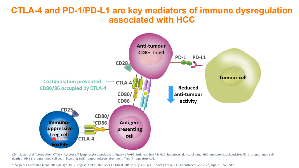 原發性肝細胞癌 (Hepatocellular Carcinoma,HCC)是目前世界上癌症發生率排名第六名,但是死亡率高達第三名,主要原因是被發現時多為中晚期且無法接受根除性治療包含肝移植,手術切除或射頻消融治療,近幾年免疫檢查點抑制劑(Immune Checkpoint Inhibitor,ICI)的發展不但增加治療的反應率,且延長病人的存活時間。