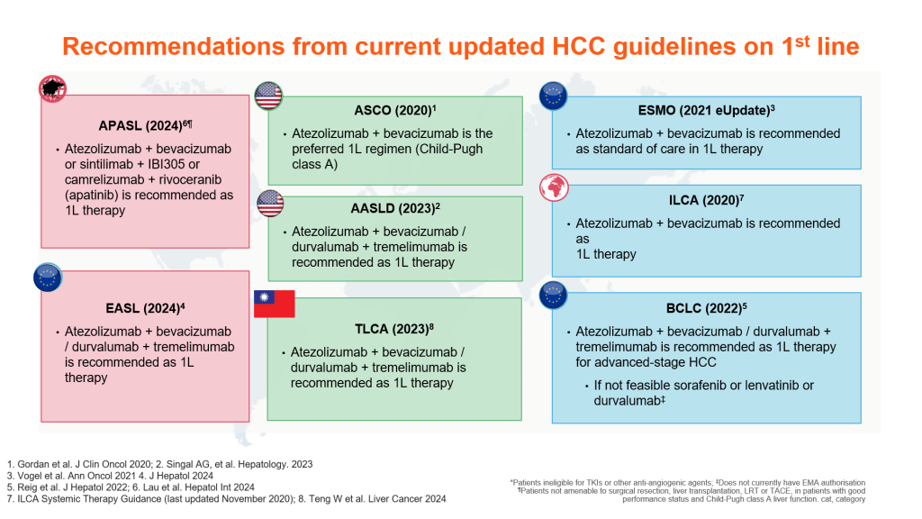 根據Barcelona Clinic Liver Cancer classification (BCLC) 2022年版治療指引,免疫藥物的治療主要是用在中期患者不適合接受手術切除或經動脈化學藥物栓塞 (TransArterial ChemoEmbolization,TACE)或是晚期患者包含門靜脈侵犯或是遠處轉移,許多國際學會包含台灣肝癌醫學會的肝癌治療指引都建議如果沒有禁忌症(如自體免疫疾病或是接受器官移植後長期使用抗排斥藥物等),免疫藥物比標靶藥物更被認為是一線治療首選。