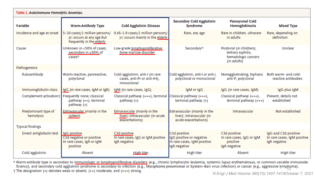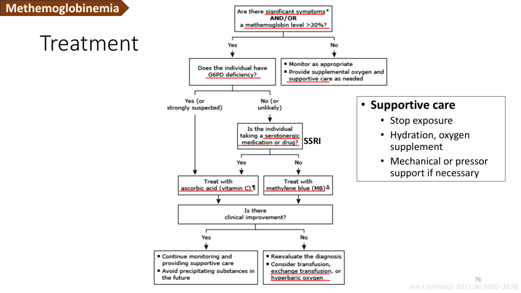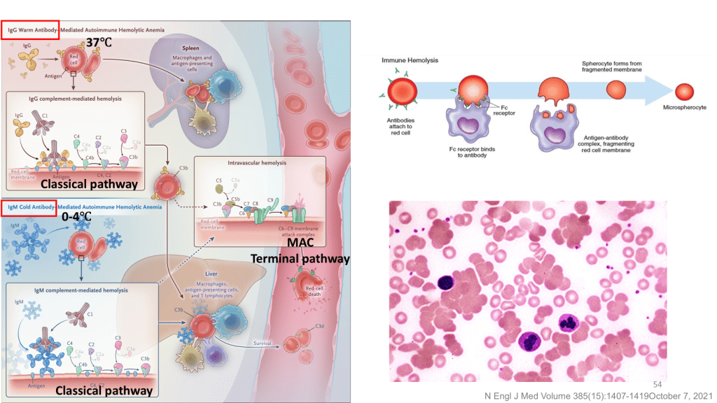 當病人表現出溶血時,要開始想到不同的鑑別診斷,除了 AIHA,藥物也有可能導致溶血。例如為了降低 uric acid 常會使用的 Rasburicase,它能將 uric acid 代謝為水溶性的 allantoin,利於排出體外,過程中也會生成 H2O2,進一步增加體內氧化壓力。這時我們需要注意患者是否有 G6PD deficiency 病史,因為此類患者無法還原快速累積的過氧化物所以也會引發溶血;除此之外,過大的氧化壓力也會使患者的 Hb 被氧化,導致 methemoglobinemia,一般情況下可以用 Methylene blue 當作還原劑,但是 G6PD deficiency 的患者應改用 ascorbic acid。