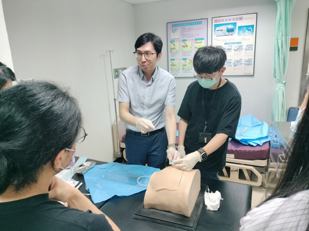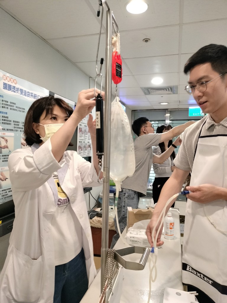 下午的實作課程包含 PD 導管模型植入操作、CAPD 換液體驗與 APD 給藥裝置觀摩,讓我首度從「病人角度」理解每日換液的技術門檻與心理負擔,讓我更能同理病人、家屬、相關護理人員承受的壓力、清潔衛教的重要性,以及導管感染風險的實際挑戰。