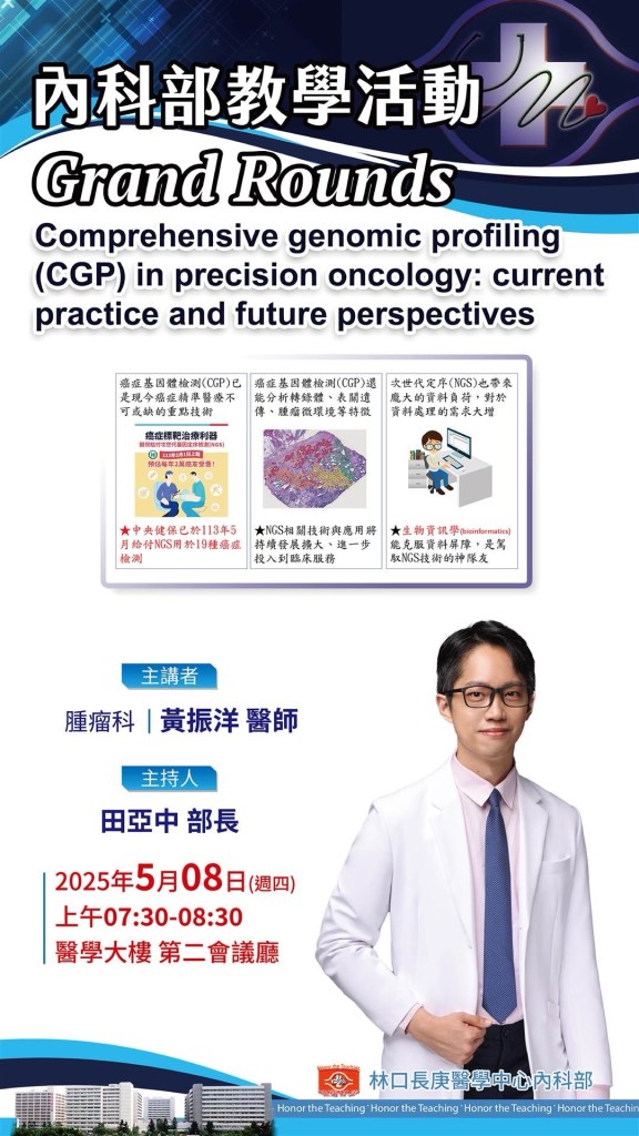 | 5/8 (四) 7:30-8:30 醫學大樓 第二會議廳 | Grand Rounds Comprehensive genomic profiling (CGP) in precision oncology: current practice and future perspectives 黃振洋 醫師/田亞中部長 | 實體無視訊 |