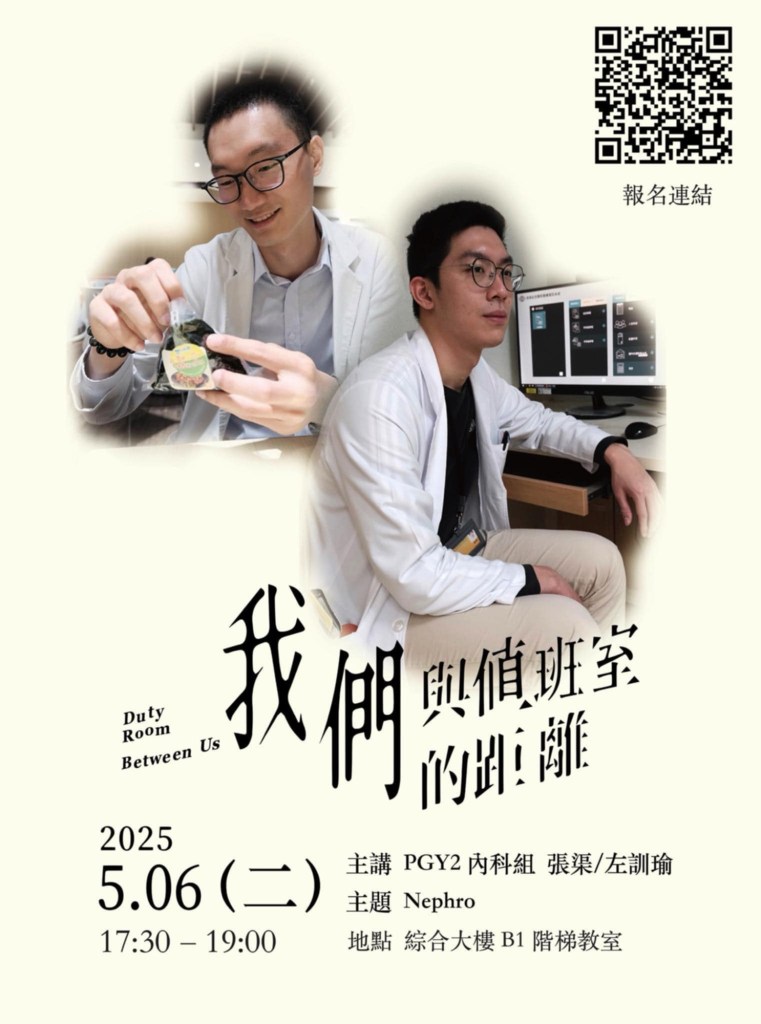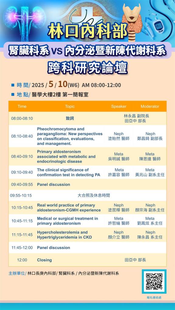 | 5/10 (六) 08:00-12:00 醫學大樓二樓 第一簡報室 | 腎臟科系與內分泌暨新陳代謝科系 跨科研究論壇 | 實體無視訊 |