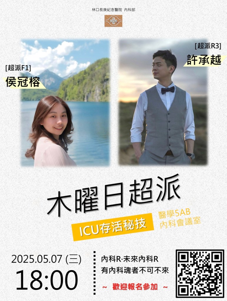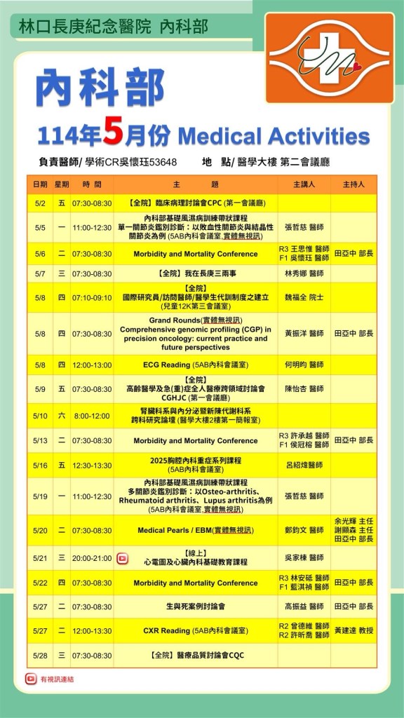 | 5/8 (四) 12:00- 13:00 醫學大樓 5AB內科會議室 | ECG Reading 何明昀 醫師 | https://cgmh.webex.com/cgmh/j.php?MTID=m190ff6a1ab0646bb24182402aa53a815 |