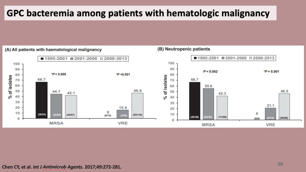在重新整理病歷資料的過程中,我看著那纏人的VRE一次又一次地出現,麴菌抗原的數值越來越高。搜索資料,感染菌株總數佔當年度所有醫療照護感染菌株總數比率中Enterococcus faecium,最近十年來所佔百分比一直呈現上升的趨勢,而MRSA感染的百分比有下降的趨勢。而研究統計結果發現VRE 菌血症對存活率影響顯著,VRE BSI組的1年存活率最低,遠低於非VRE BSI和未發生BSI。所以可以想見,了解VRE BSI的風險因子和處理是有機會改善存活率的。研究顯示抗生素輪替策略有效減少Carbapenem使用,並降低VRE colonization與感染率,可改善細菌耐藥性生態。其實重點就是為了減少抗藥性細菌的產生,我們應該要試著調整抗生素的使用。